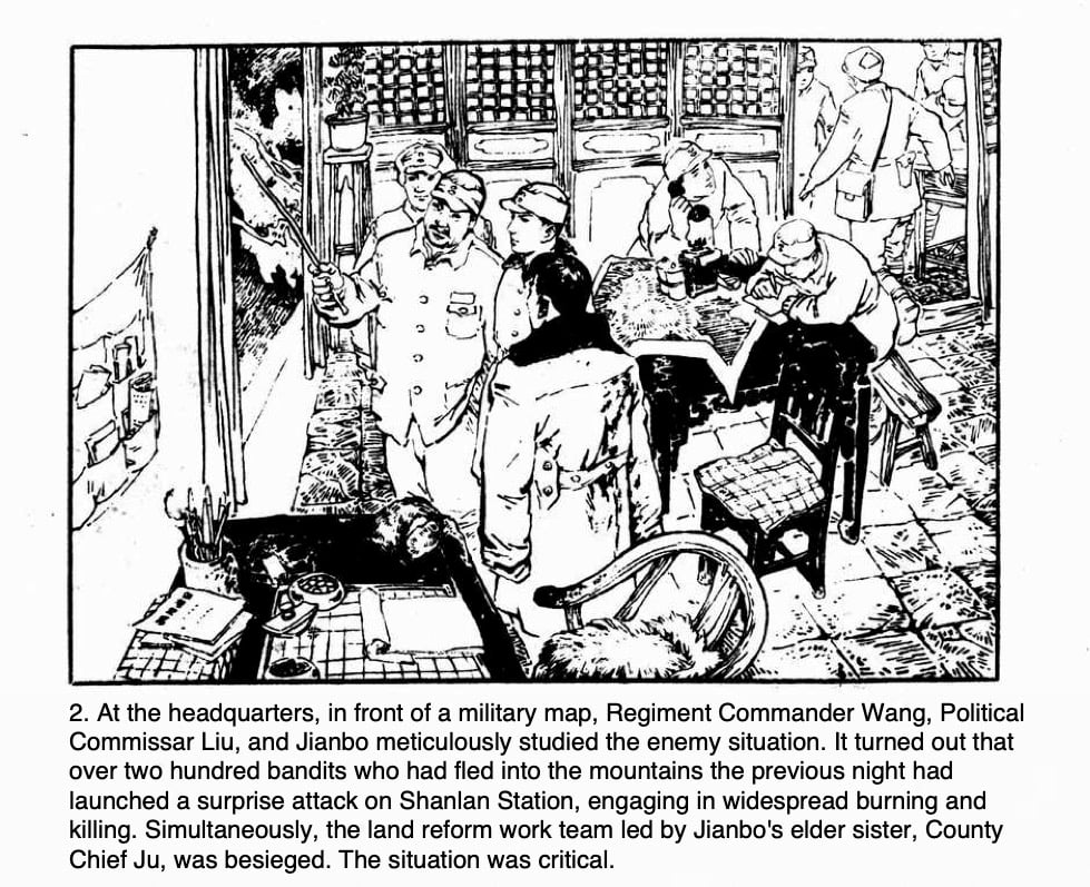 2. At the headquarters, in front of a military map, Regiment Commander Wang (王团长), Political Commissar Liu (刘政委), and Jianbo meticulously studied the enemy situation. It turned out that over two hundred bandits who had fled into the mountains the previous night had launched a surprise attack on Shanlan Station (杉岚站), engaging in widespread burning and killing. Simultaneously, the land reform work team led by Jianbo's elder sister, County Chief Ju (鞠县长), was besieged. The situation was critical.