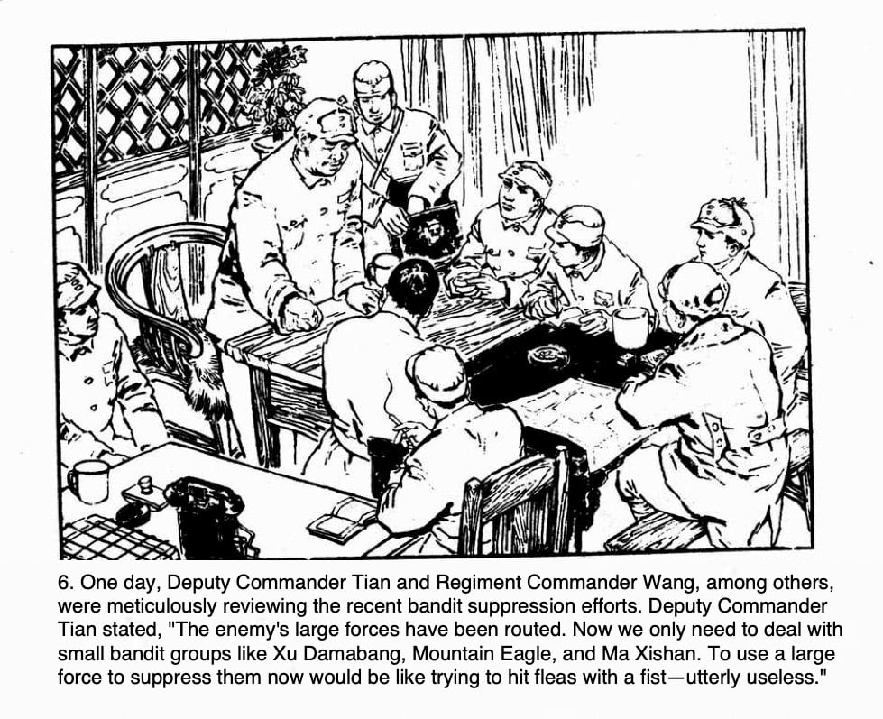 6. One day, Deputy Commander Tian (田副司令) and Regiment Commander Wang, among others, were meticulously reviewing the recent bandit suppression efforts. Deputy Commander Tian stated, "The enemy's large forces have been routed. Now we only need to deal with small bandit groups like Xu Damabang, Mountain Eagle, and Ma Xishan (马希山). To use a large force to suppress them now would be like trying to hit fleas with a fist—utterly useless."