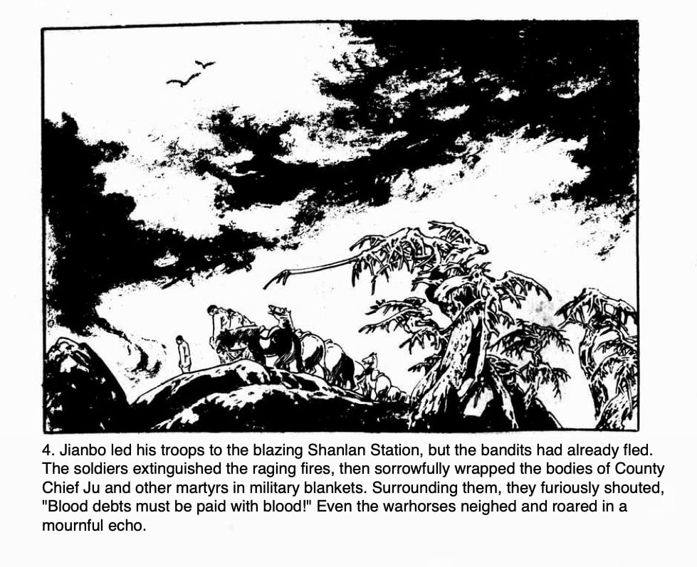 4. Jianbo led his troops to the blazing Shanlan Station, but the bandits had already fled. The soldiers extinguished the raging fires, then sorrowfully wrapped the bodies of County Chief Ju and other martyrs in military blankets. Surrounding them, they furiously shouted, "Blood debts must be paid with blood!" Even the warhorses neighed and roared in a mournful echo.