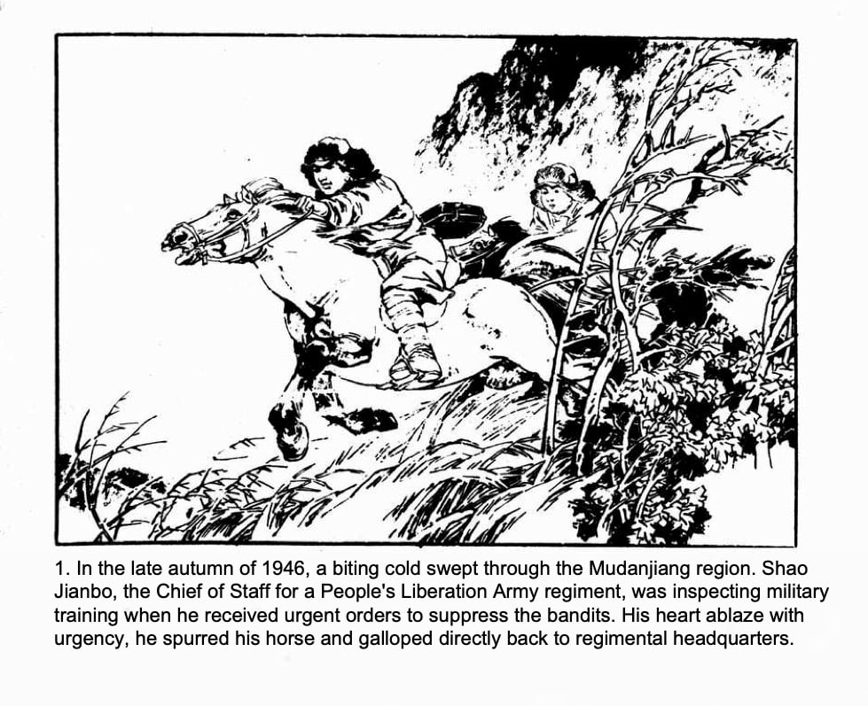 1. In the late autumn of 1946, a biting cold swept through the Mudanjiang (牡丹江) region. Shao Jianbo, the Chief of Staff for a People's Liberation Army regiment, was inspecting military training when he received urgent orders to suppress the bandits. His heart ablaze with urgency, he spurred his horse and galloped directly back to regimental headquarters.