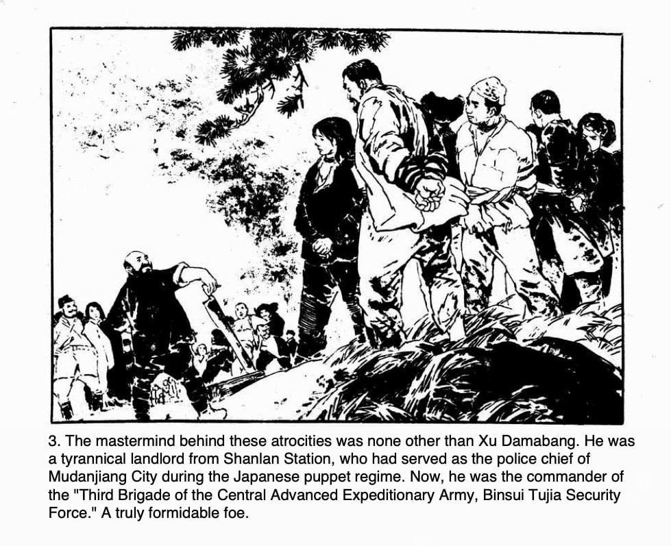 3. The mastermind behind these atrocities was none other than Xu Damabang. He was a tyrannical landlord from Shanlan Station, who had served as the police chief of Mudanjiang City during the Japanese puppet regime. Now, he was the commander of the "Third Brigade of the Central Advanced Expeditionary Army, Binsui Tujia Security Force." A truly formidable foe.