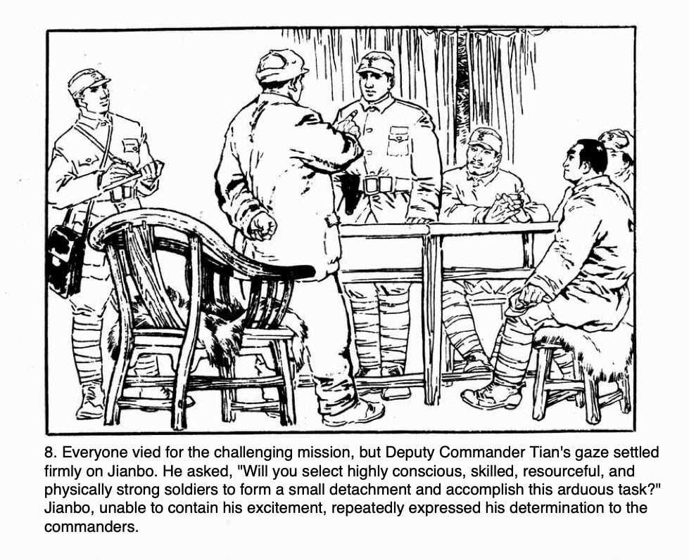 8. Everyone vied for the challenging mission, but Deputy Commander Tian's gaze settled firmly on Jianbo. He asked, "Will you select highly conscious, skilled, resourceful, and physically strong soldiers to form a small detachment and accomplish this arduous task?" Jianbo, unable to contain his excitement, repeatedly expressed his determination to the commanders.