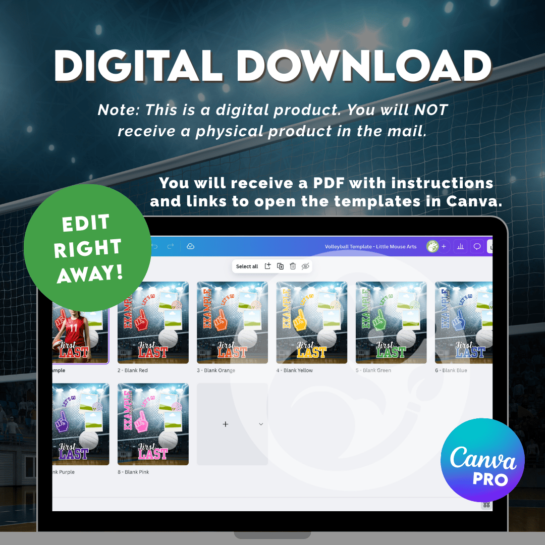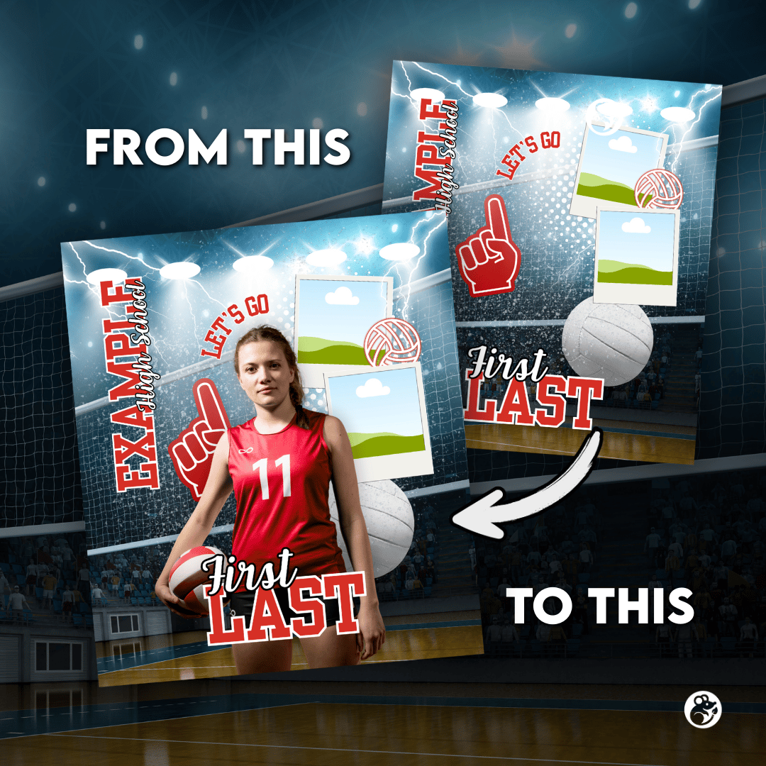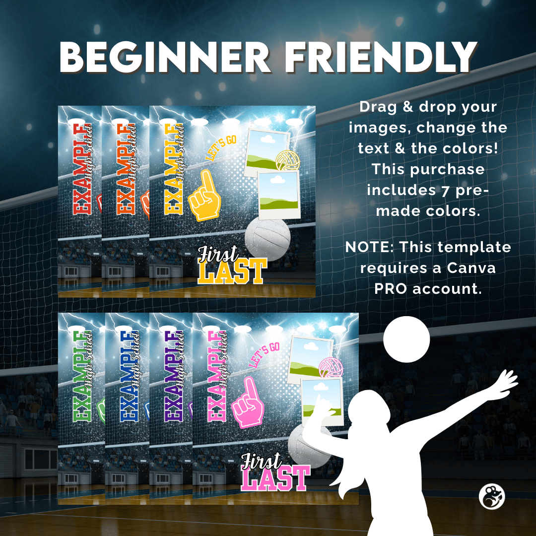 I’ve pre-made 7 color variations (red, orange, blue, green, yellow, pink, purple) so you can quickly match your school or team colors. Just drop in your player’s photo, update the text (name, school, year, etc.), and export your finished design!