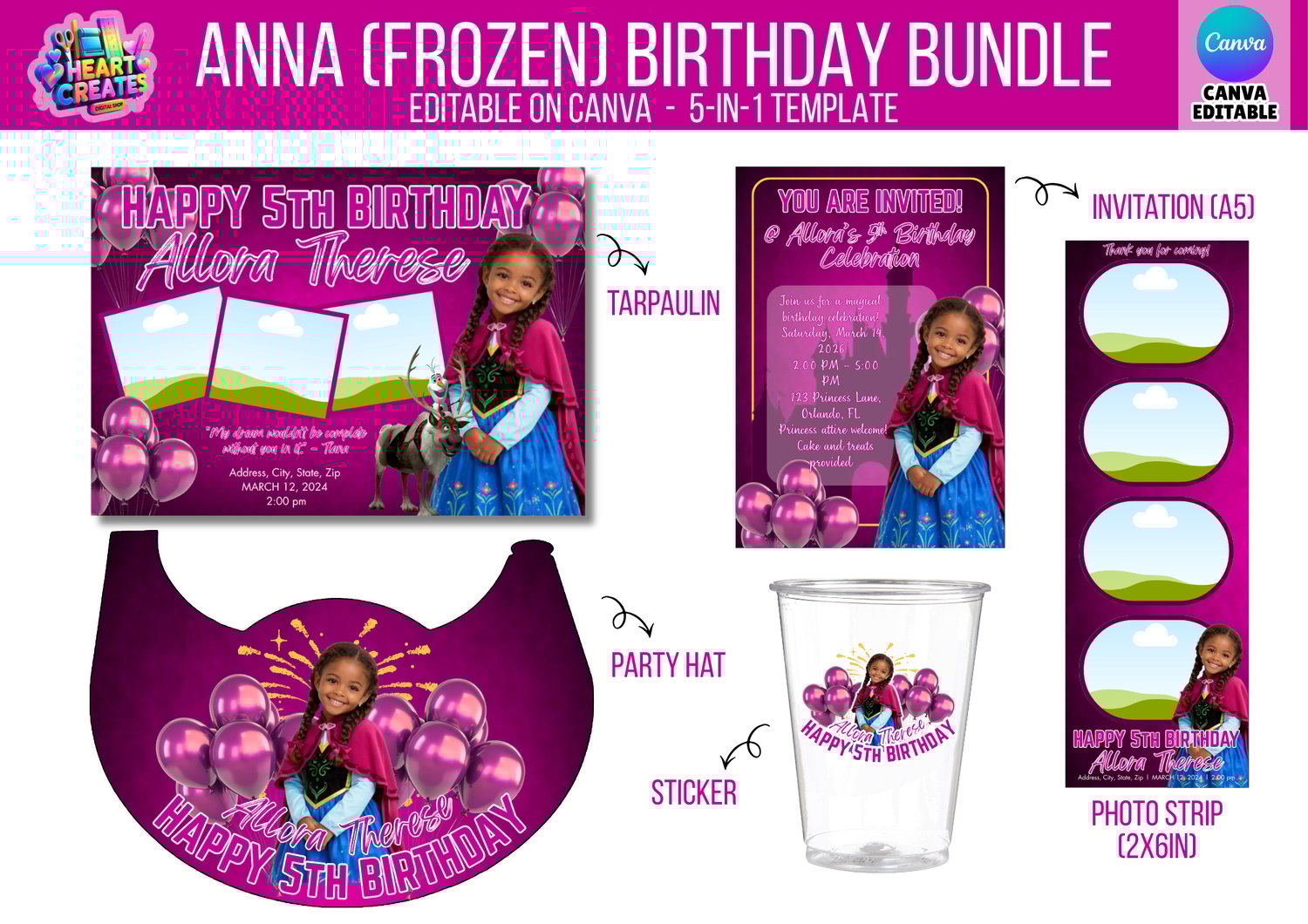 Make your child’s birthday full of adventure and magic with this Anna Frozen Inspired Birthday Bundle Template! This beautiful editable Canva template set features a charming winter princess theme inspired by snowy celebrations, perfect for creating a coordinated and unforgettable birthday party.
