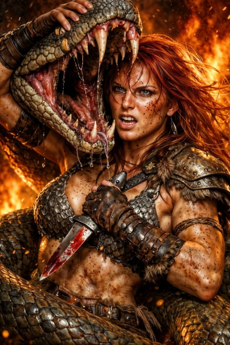 Step into a world of ice and legend with this breathtaking 12K Red Sonja artwork—a cinematic clash of steel, snow, and untamed power. Sonja stands fearless against a towering mammoth in a frozen mountain pass, every detail rendered with razor-sharp clarity: wind-whipped crimson hair, frost-bitten fur, glinting steel, swirling snow, and the sheer scale of the beast looming behind her.