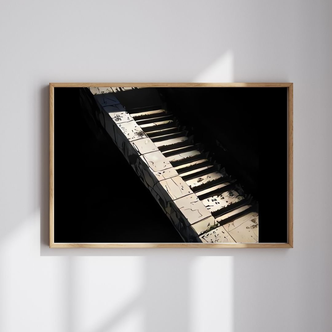 Gently weathered details make this artwork ideal for fans of keyboard wall decor, piano art print styles, and heartfelt gifts for musicians or composers. Its monochrome tones blend easily with modern, rustic, or vintage-inspired spaces while still making a striking visual statement.
