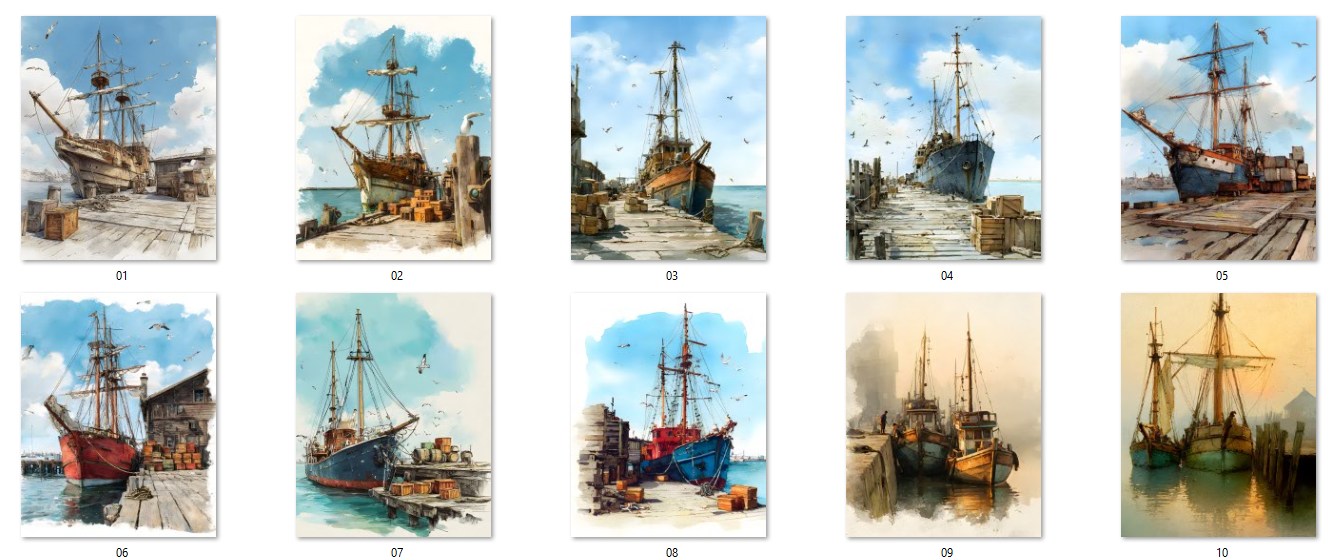 What You Get: On the Dock – Harbor Ships & Port Life | Nautical Art Bundle (10 Images)