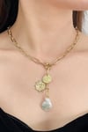 Style: ModernMaterial: Copper, Freshwater pearlCare:Avoid wearing during exercise, as sweat will react with the jewelry to produce silver chloride and copper sulfide, which causes the jewelry to deteriorate and corrode over time.While wearing the pearl necklace, avoid exposure to the sun and contact with highly volatile substances such as perfume and hairspray, as it will easily fade in color and lose its luster.ImportedProduct measurements:Chain length: 17.5 inPendant height: 3 inWeight: 1 oz