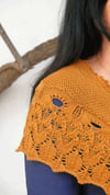 Knitting begins at the bottom edge, several lace motifs are worked before it’s shaped into a crescent. The knitter has the choice of finishing the top edge with a frilly little applied border, or doing a simple loose bind off.