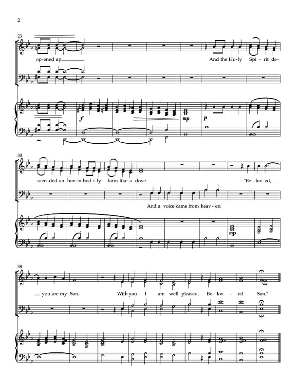 A simple yet evocative setting of Luke 3: 21-22, appropriate for celebrating the baptism of our Lord. The vocal parts are often doubled by the organ, making this accessible piece appropriate for church choirs of any size.