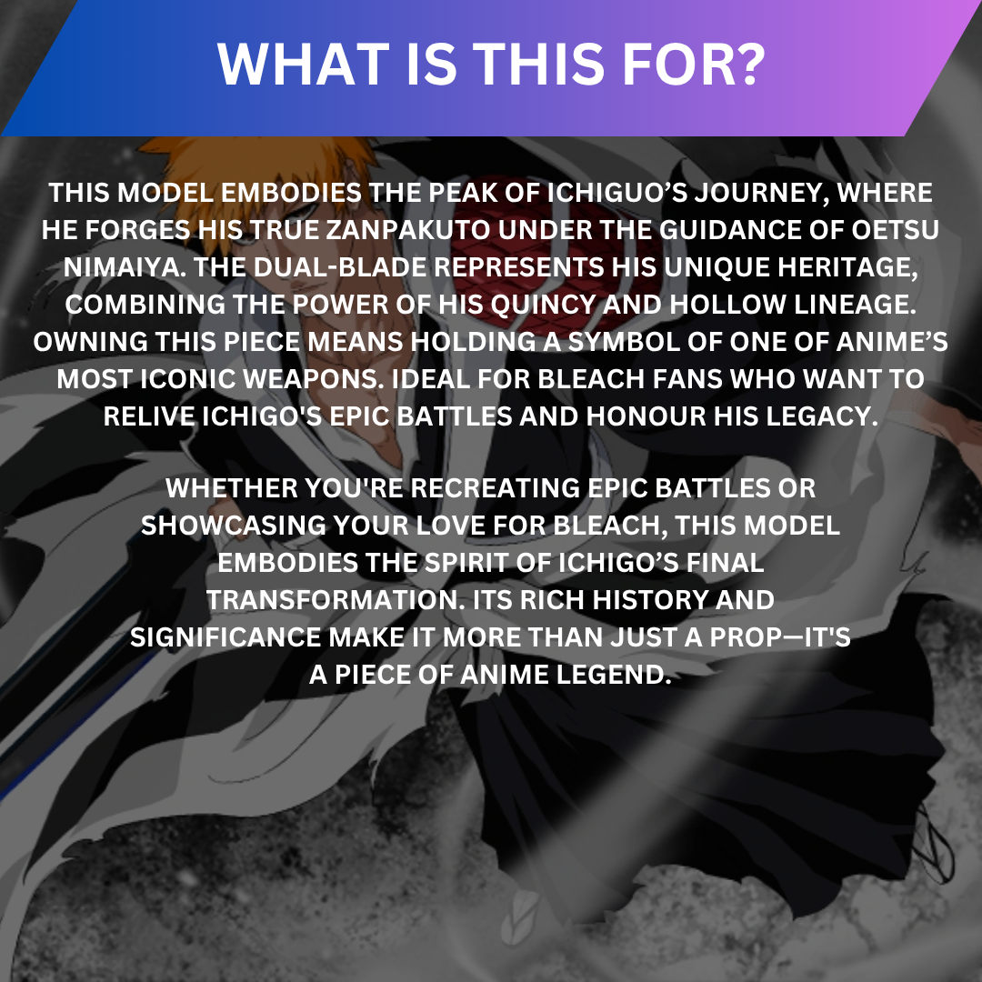Dive deeper into the lore of Bleach with Ichigo’s True Zanpakuto, a symbol of his evolution and inner strength. This model captures the essence of Ichigo’s character and lets you relive pivotal moments from the anime. Whether you're gearing up for cosplay or adding a centrepiece to your collection, this Zanpakuto stands as a testament to Ichigo's legacy and the enduring impact of Bleach.