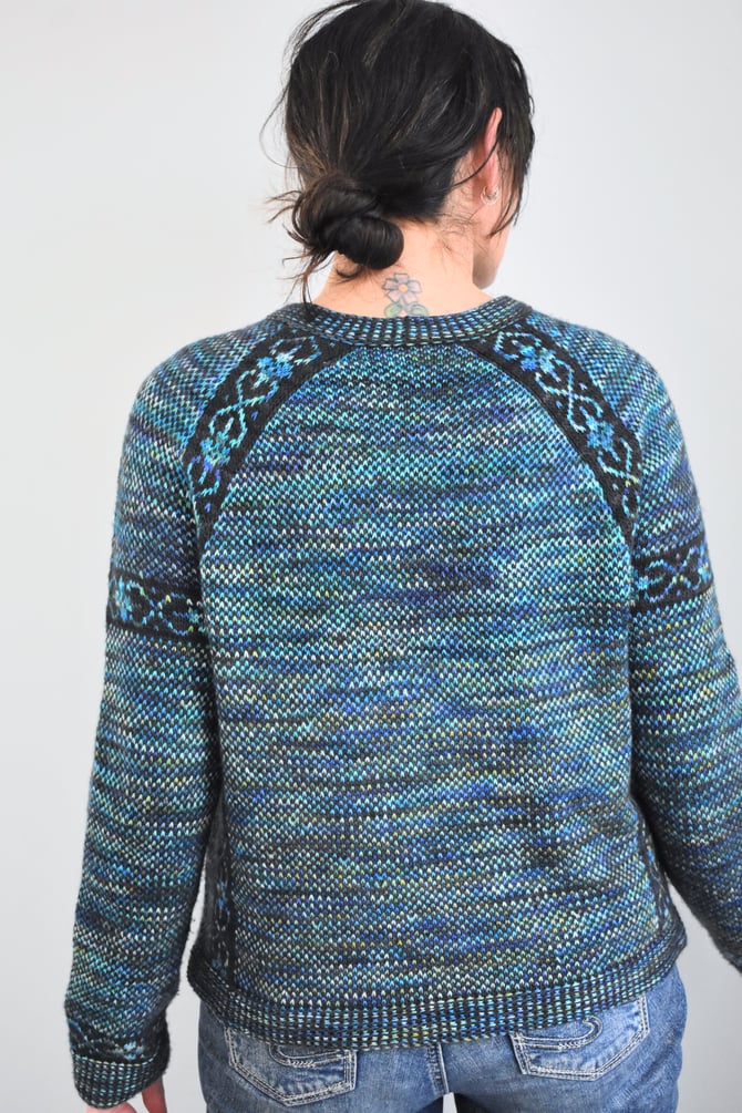 Labradorite with its mesmerizing iridescence and interplay of color, and its character enhanced by the veins that run through it. Ten Mile Bay in Labrador is home to a labradorite quarry and inspired this sweater.
