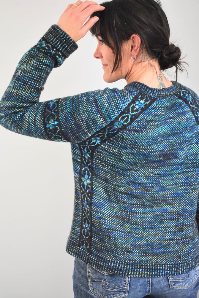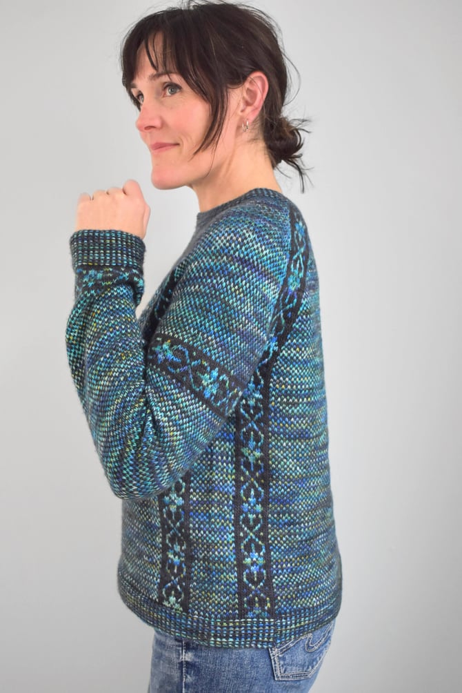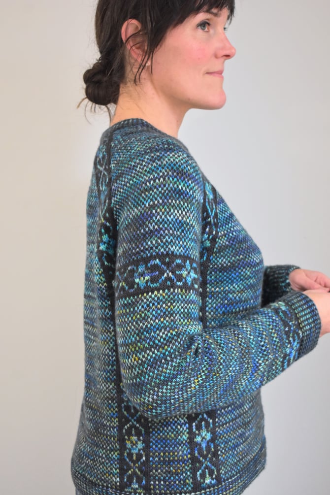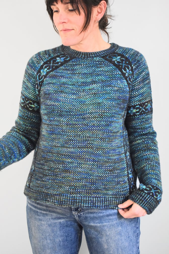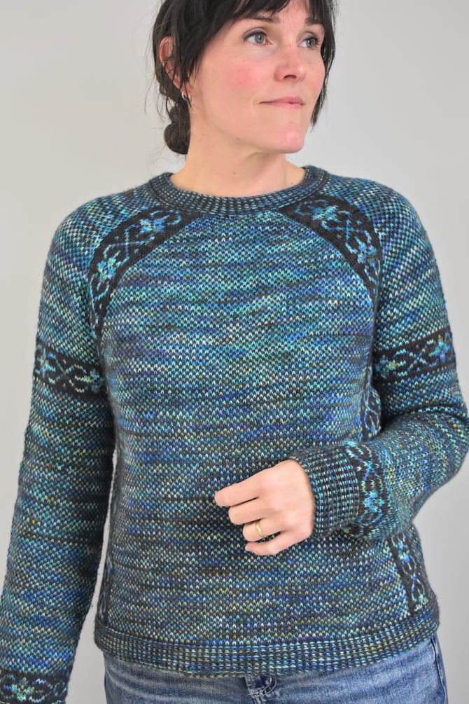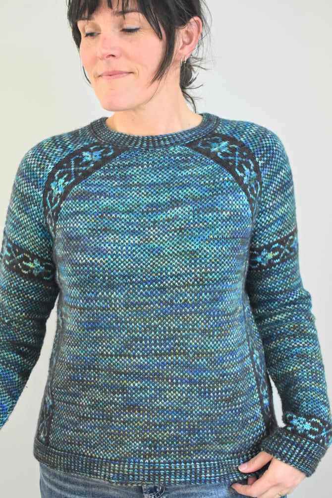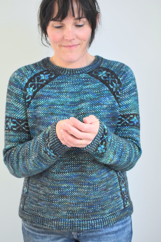 Ten Mile Bay is a top down raglan, evoking the feel of Joe Batt’s Arm. This Ten Mile Bay raglan is worked top down and in the round, and the colorwork is ordinary stranded knitting using 2 colours. A little bit of Front neck shaping is done at the very start with the stranded colorwork worked flat for 6 rows, then you join at the Front neck and the remaining sweater is worked in the round. Raglan increases are made through the yoke to the underarm. Sleeve and Body stitches are divided, sleeve stitches are placed on hold, and the Lower Body is worked in the round down to the hem. Stitches around the neck are picked up and the neckband is worked in the round. Lastly, sleeves are worked down to the cuffs. The neckband, cuffs, and hem feature a 2 colour stranded garter stitch, cohesively enhancing the aesthetic of Ten Mile Bay.