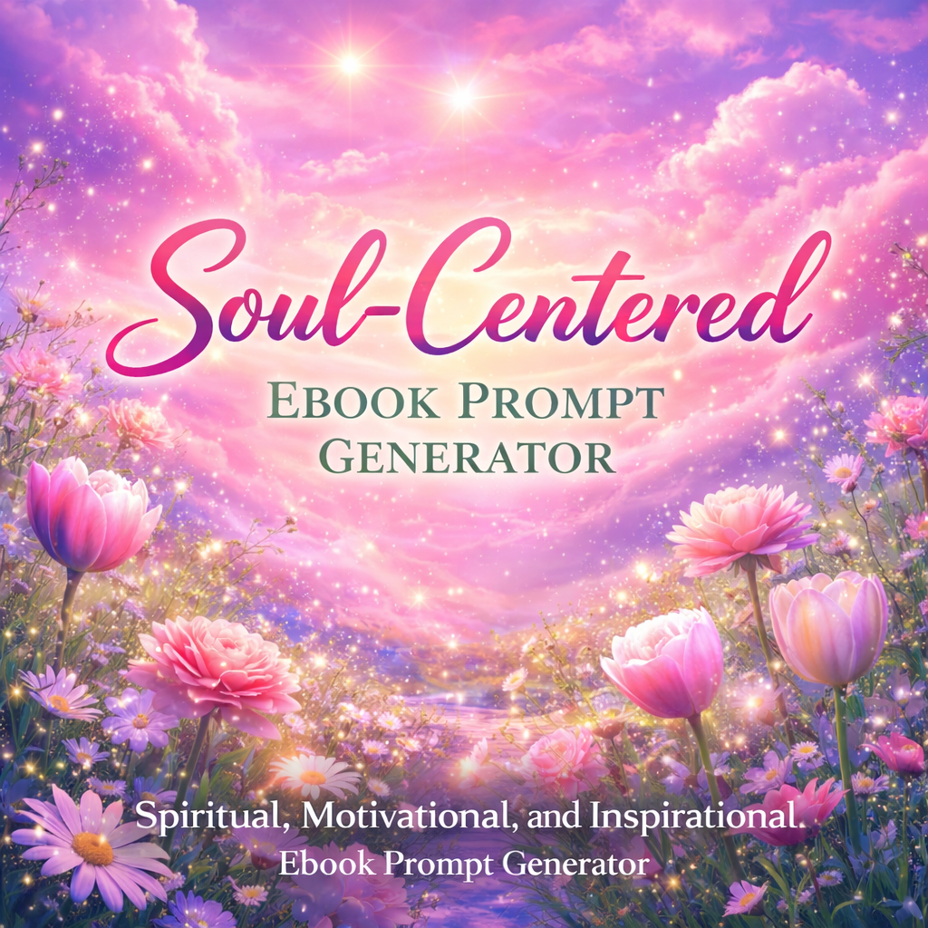 The Soul-Centered Ebook Prompt Generator is a beautifully designed, done-for-you creative system created to help you write calm, meaningful, high-vibration ebooks rooted in spirituality, mindfulness, positivity, and motivation — even if you don’t know where to start.