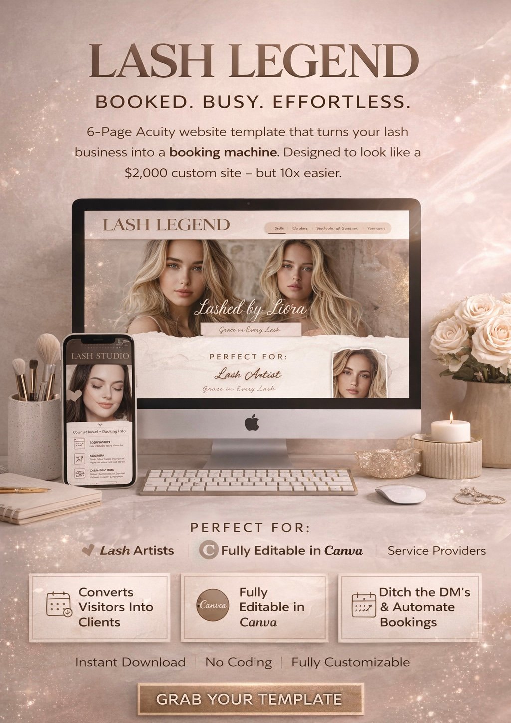 Elevate your lash business with LASH LEGEND: 4 Page Acuity Site! This Canva template features 4 sleek, professional pages for showcasing your services, pricing, portfolio, and booking policies, making client scheduling effortless.