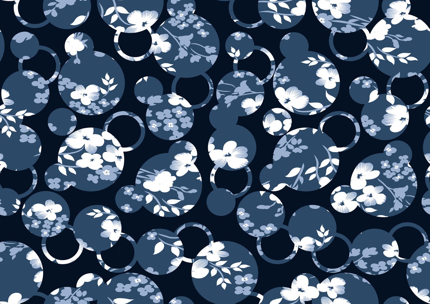 White floral-filled Mickey head silhouettes on dark blue base