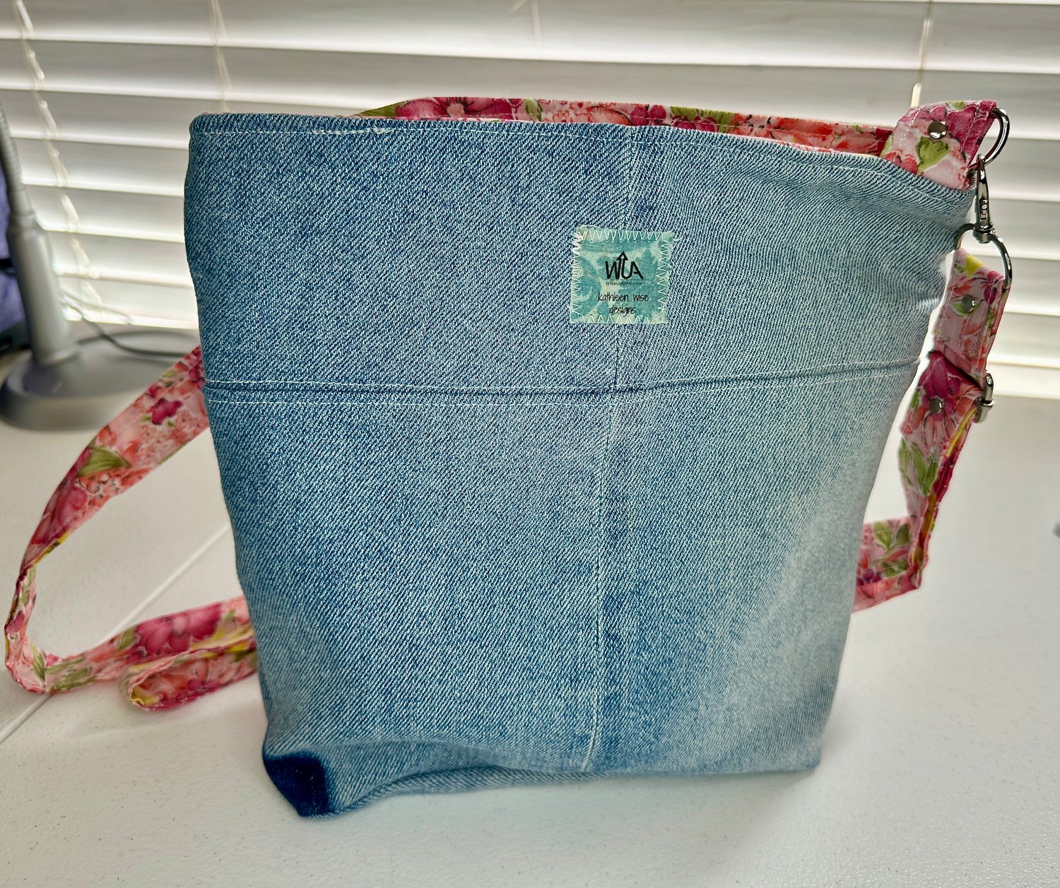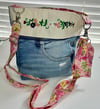 This trendy crossbody bag is made from up-cycled, name-brand denim jeans. Salvaging the front pocket and features a hand-embroidered panel that coordinates beautifully with the floral pink lining and strap. The interior is made from new 100% cotton. Features include a zip pocket and pen/slip double pocket. Magnetic snap closure. Includes coordinating lip balm holder keychain.