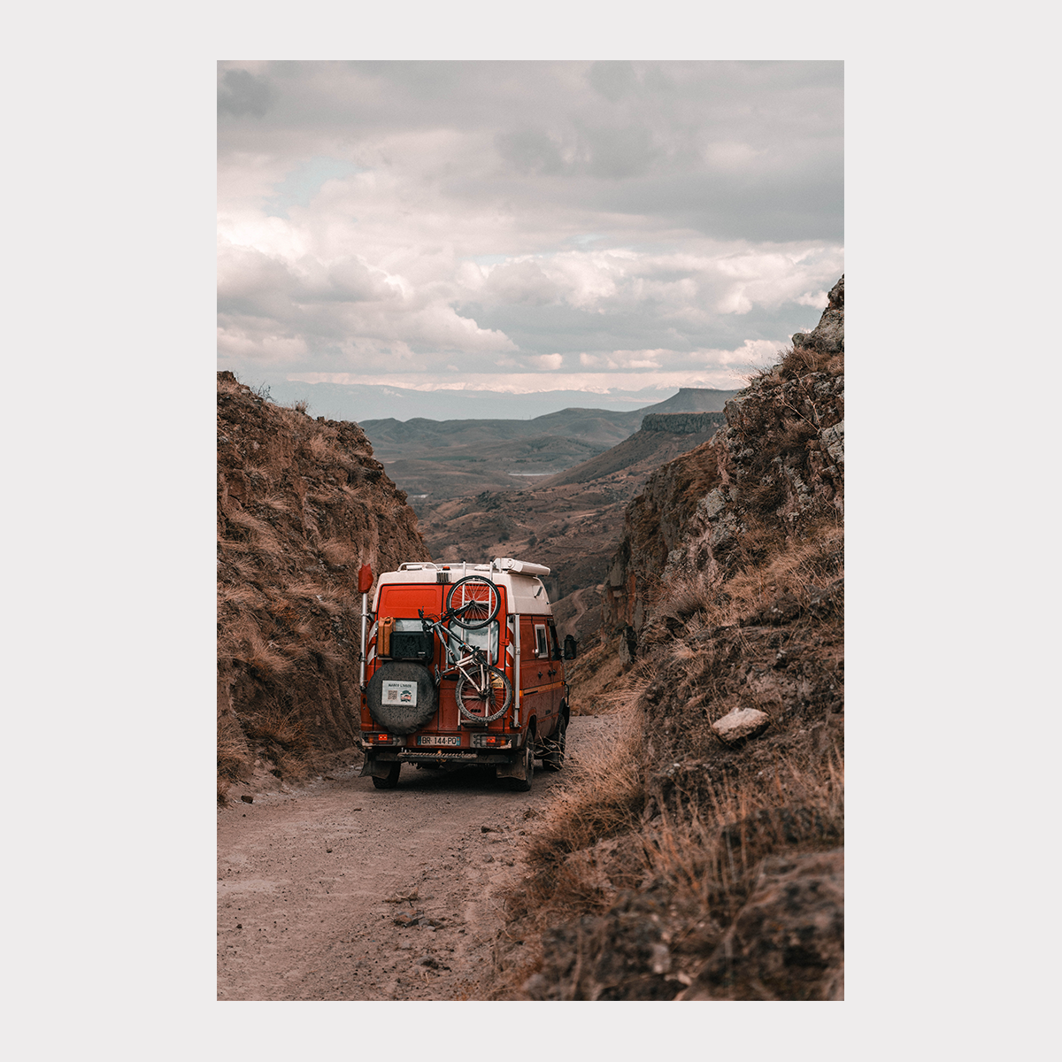 Cette photo a été prise en Cappadoce, en Turquie, sur une piste étroite serpentant entre deux parois rocheuses. On y voit Marco, mon fidèle compagnon de route, progressant dans cette gorge minérale qui nous menait vers l’un des canyons les plus impressionnants de la région. Pour une fois, je ne voyageais pas seul : deux voyageurs rencontrés en chemin partageaient ce bout d’aventure avec moi. Cette image marque un passage — celui qui mène vers plusieurs jours suspendus entre exploration, rires et soirées au coin du feu, au cœur de paysages façonnés par le temps et l’histoire.