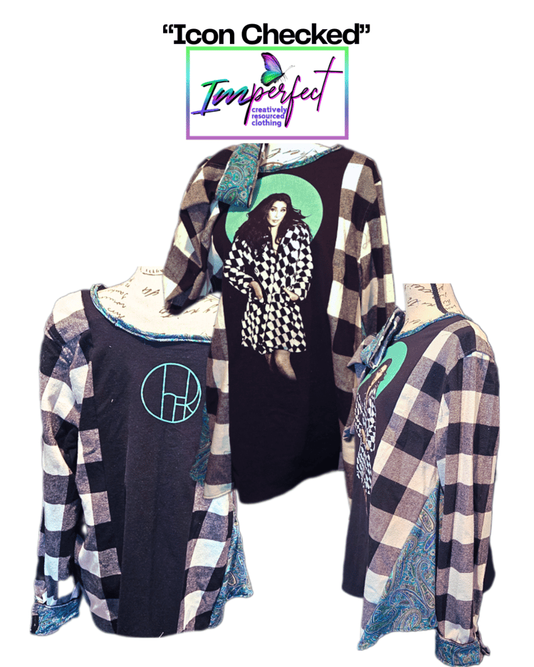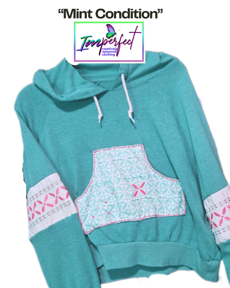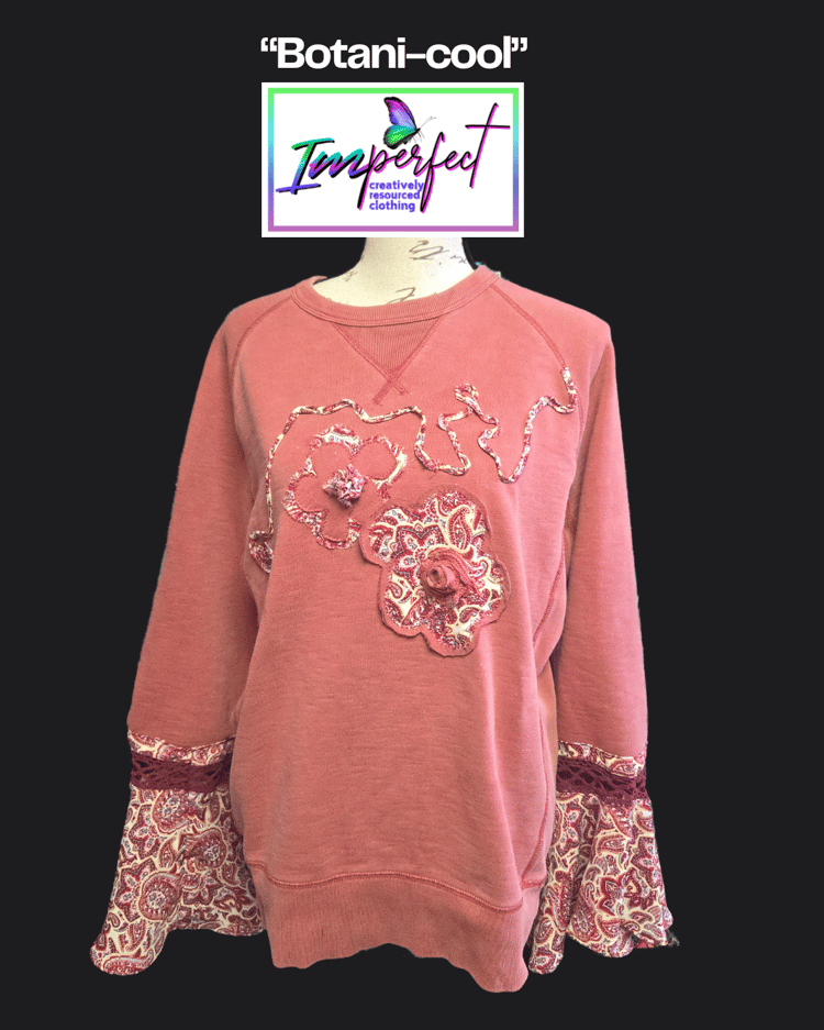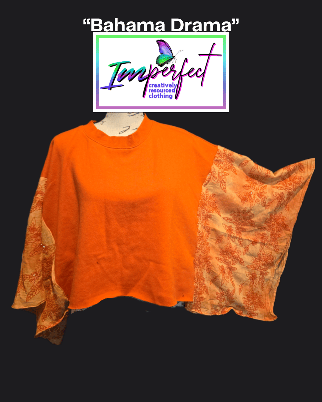 Orange crewneck, meet your funky side. This mashup brings bold, floral-embroidered, bugle-beaded sleeves and boho flow to your quiet classic. I upcycle joy—color, texture, and a whole lotta happy—because cool freaking textures deserve a second life. 🍊🌺