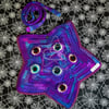 Crochet star-shaped purse with fabric lining, 1 interior and 1 exterior pocket, snap closure, and a detachable strap.