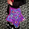 Representing a transition from summer to fall, one side of the bag fades from butter yellow through a sunset of colors to the other side which is full of purples and blues. It is embellished with eye applique, a chain of star charms, and eye embroidery on the strap.