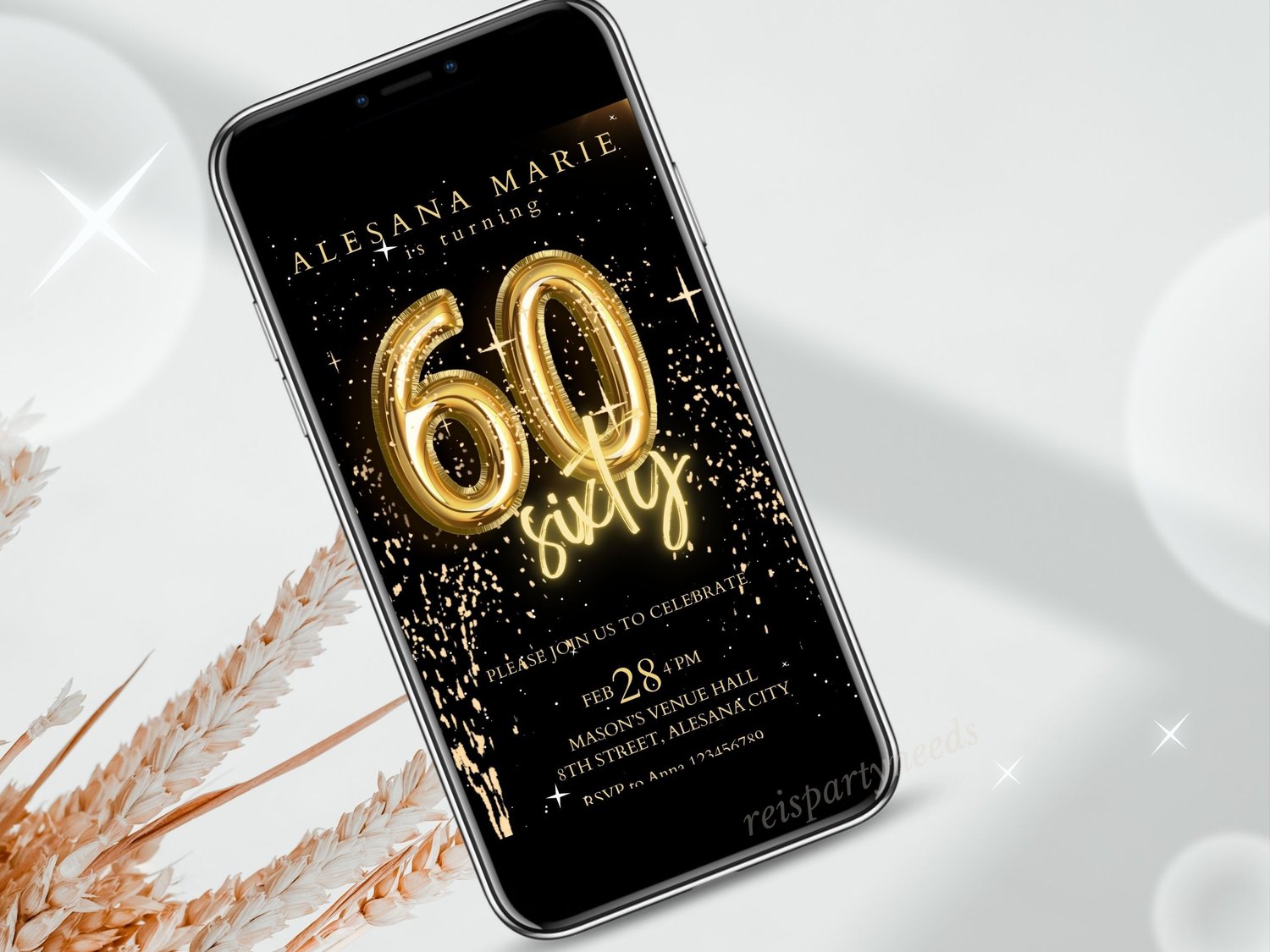 Gold Sixty 60th Birthday Digital Invitation Template, Black and Gold Sixty Video Invitation Announcement, Electronic Invite, Animated Birthday Invite, 60th Video Bday