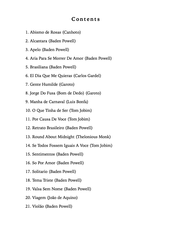 This is performance-ready repertoire. Baden Powell's harmonic language — extended jazz voicings, suspended chords, chromatic voice leading — is preserved with minimal modification, staying as close as possible to what's heard on the recordings. The pieces are technically accessible despite their harmonic sophistication: comfortable positions, no virtuosity required. The main challenge is sustaining focus through longer pieces, many of which deliver five to six minutes of music each.