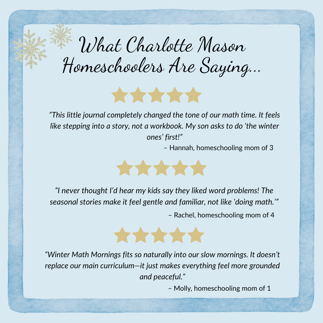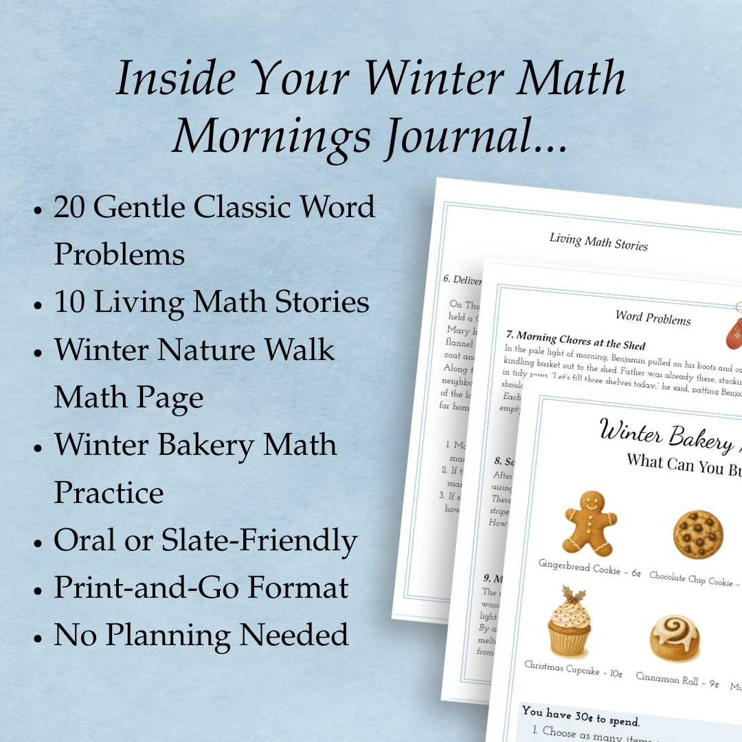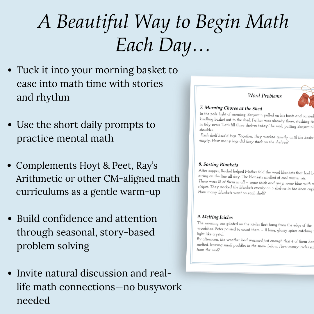 This seasonal journal draws your child into living math through thoughtful word problems and simple winter scenes. It reflects the kind of math Charlotte Mason encouraged—practical, real-world, and gently built into your day.