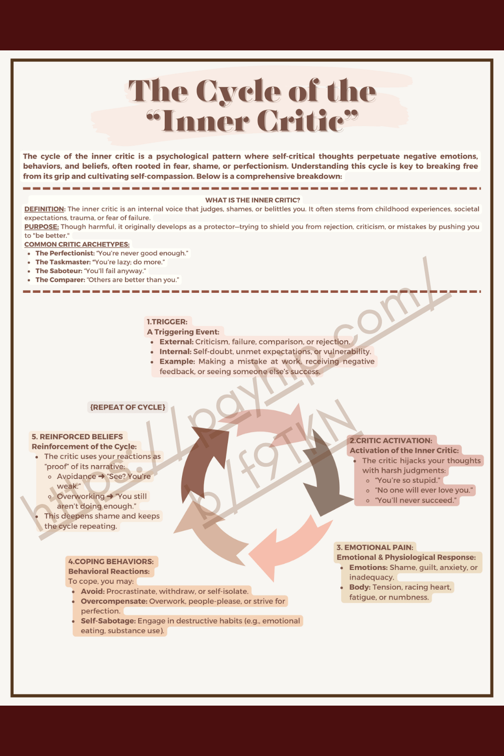 The cycle of the inner critic is a psychological pattern where self-critical thoughts perpetuate negative emotions, behaviors, and beliefs, often rooted in fear, shame, or perfectionism. Understanding this cycle is key to breaking free from its grip and cultivating self-compassion. This worksheet offers a comprehensive breakdown of the cycle of the inner critic.