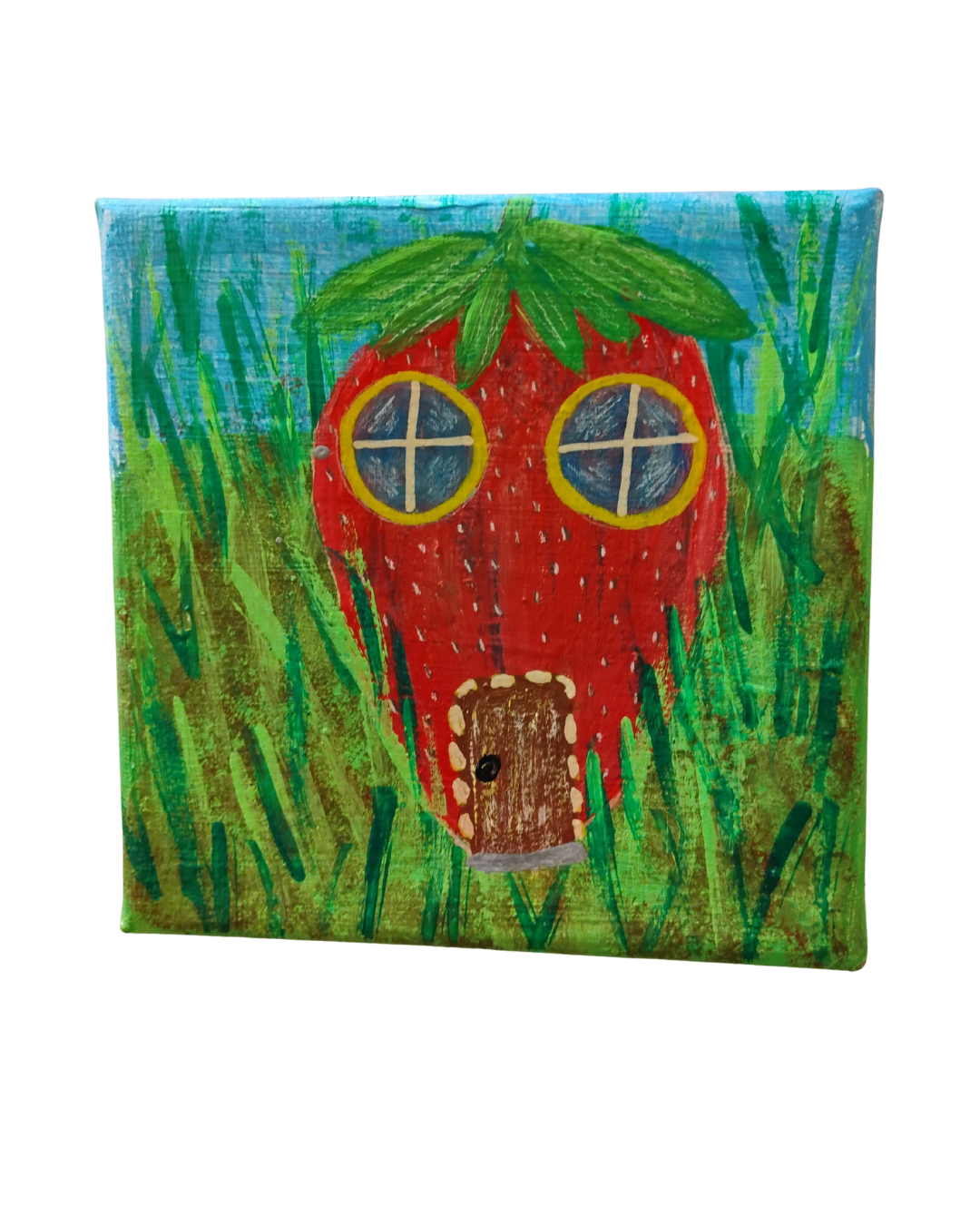 Little strawberry house in the grass. On 5x5 canvas magnet. All so great for shelf decoration!