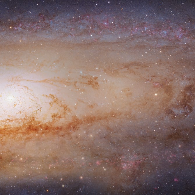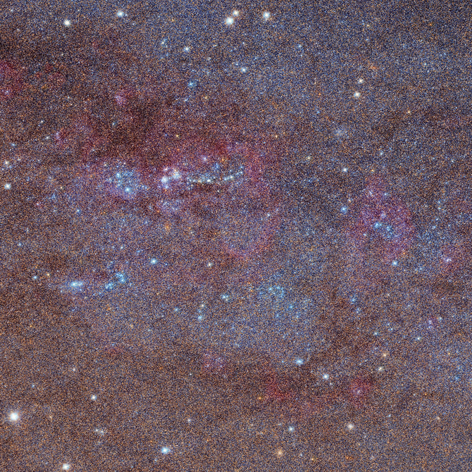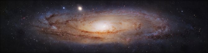 This is the largest photomosaic ever assembled from NASA/ESA Hubble Space Telescope observations. It presents a sweeping panoramic view of our neighboring Andromeda galaxy, located 2.5 million light-years away. Creating this vast and colorful portrait took more than a decade and required over 600 individual Hubble snapshots. The mosaic reveals the radiant glow of 200 million stars, spread across an astonishing 2.5 billion pixels. To complete the composition and depict the galaxy’s full disk, missing regions were filled with two public domain ground-based images captured by astronomers Kees Scherer and Stephen Rahn. The full panorama canvas is 50270 x 12850 pixels or 646 megapixels.