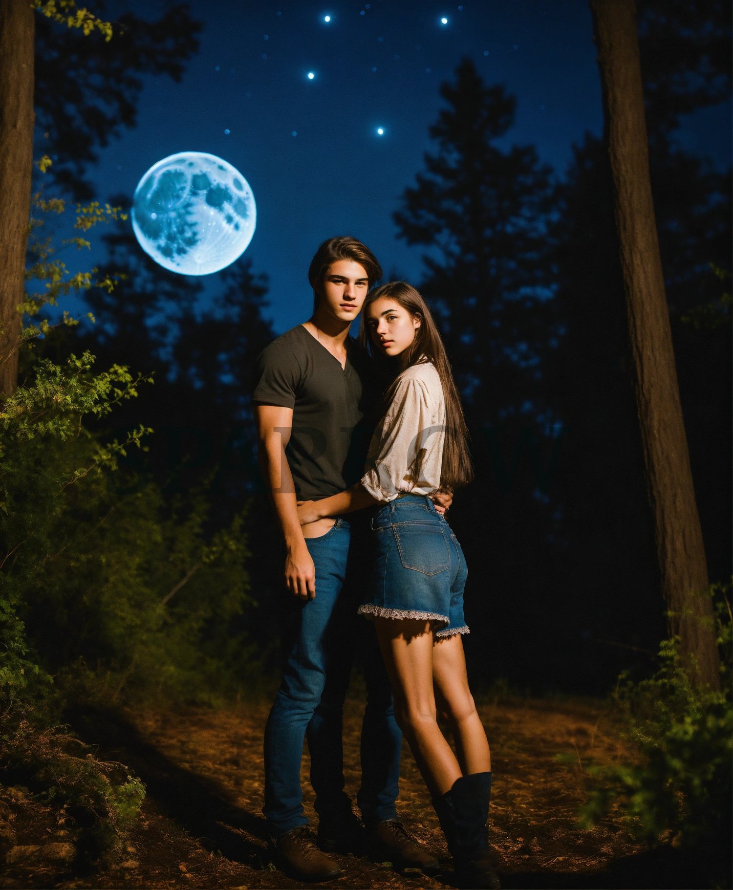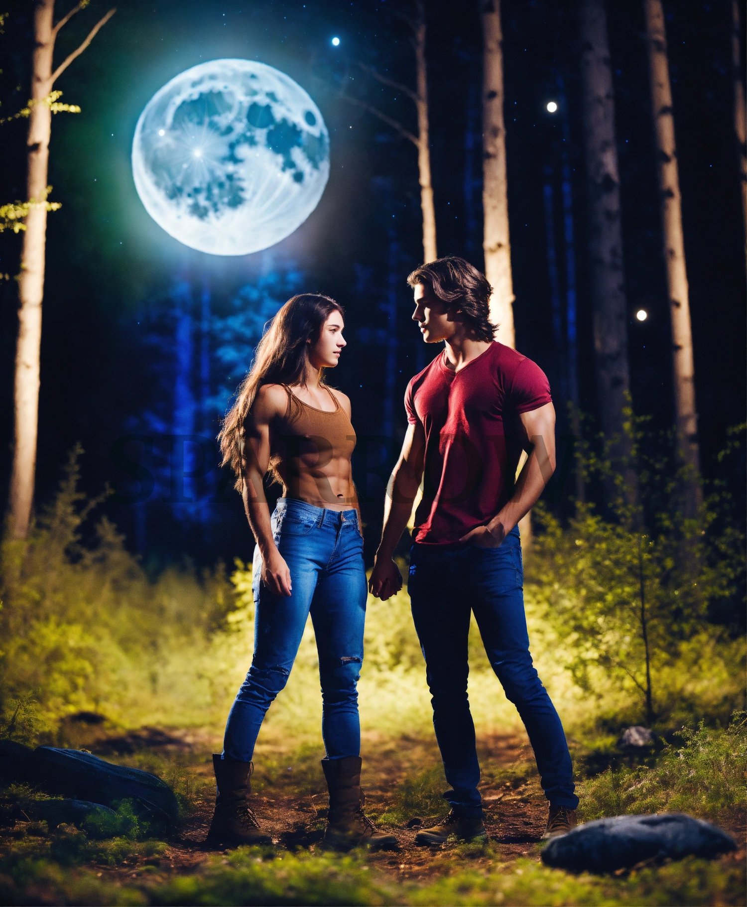 Keywords include: Paranormal romance, Love and supernatural, Fantasy couple, Ghostly love, Mystic romance, Enchanted lovers, Otherworldly passion, Supernatural relationship, Magical embrace, Eerie romance, Ethereal couple, Haunting love, Dark fantasy love, Mysterious connection, Ghostly soulmates, Fantasy love story, Paranormal passion, Enigmatic lovers, Mystic bonding, Spooky romance, Stock image, High-resolution, Fantasy background, Romantic scene, Love concept, Storytelling, Digital art, AI, Creative design, Surreal atmosphere, Dreamy backdrop, Magical elements, Beautiful couple, Artistic composition, Commercial use, Atmospheric lighting, Mystical setting, Relationship concept, Emotive characters, Fictional love, Editorial use, Advertising, Marketing, Social media, Website design, Blog post, Article illustration, Book cover, Magazine layout, Poster design, Brochure, Presentation, E-book, Print material, Digital publication, Educational materials, Background image, Wallpaper, Conceptual art, Storytelling Wolf shifter couple, Full moon background, Romantic moonlit scene, Alpha wolf pack, Fated mates embrace, Shapeshifter love, Enchanted forest setting, Moonlit meadow, Mystical bond, Howling wolves, Silhouetted trees, Nighttime romance, Alpha male and female, Lycanthropy fantasy, Supernatural passion, Mystic atmosphere, Moonlit wilderness, Fierce connection imagery, Romantic wolf eyes, Moonlit path, young adult romance, YA, PNR, paranormal romance, vampire, vampire hunter, Little Red Riding Hood, serialized online fiction cover image, Radish, Dreame, GoodNovel, iReader, Vella, SWAG, book, author, writer, blogger, creator