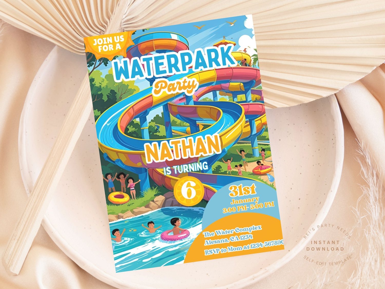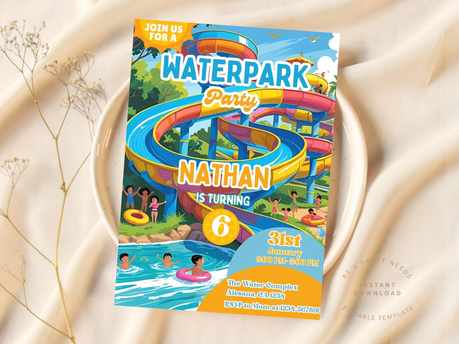 Water Park Birthday Invitation, Water Park Party Invitation, Summer Pool Party, Waterslide Birthday Party, Instant Download, Editable, Canva Template