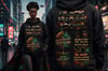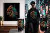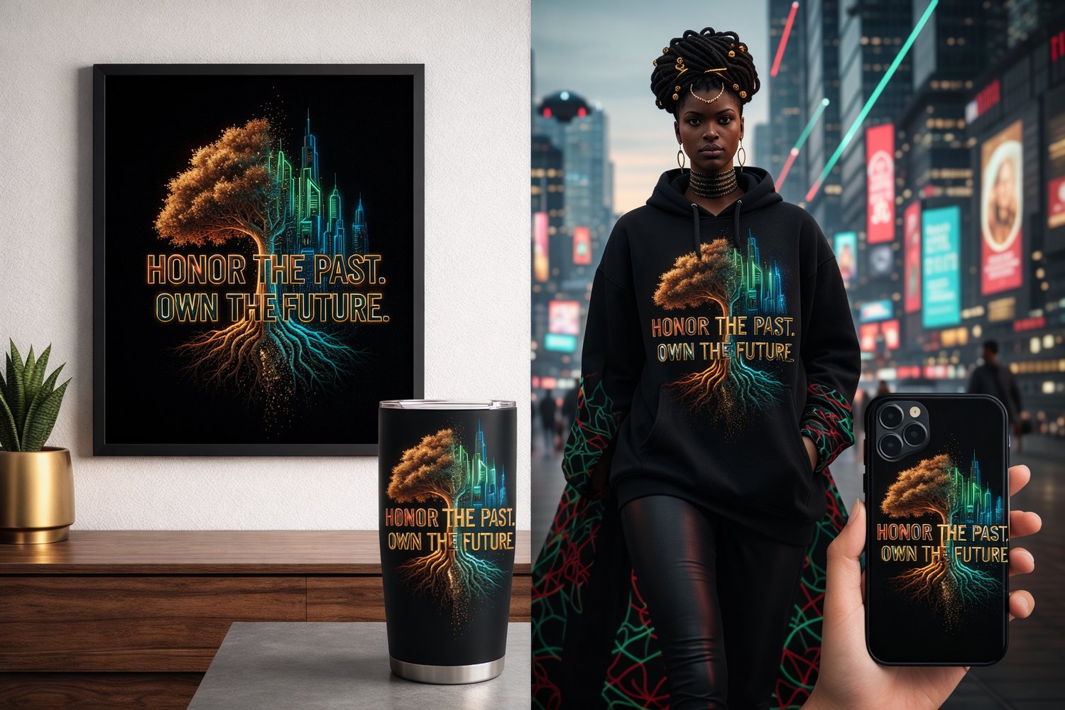 Each piece features futuristic chrome typography, Pan-African color accents (red, black, green, and gold), and symbolic imagery such as heritage trees, crowns, ancestral figures, and futuristic cityscapes. The result is a museum-grade yet streetwear-ready collection that honors the past while boldly claiming the future.