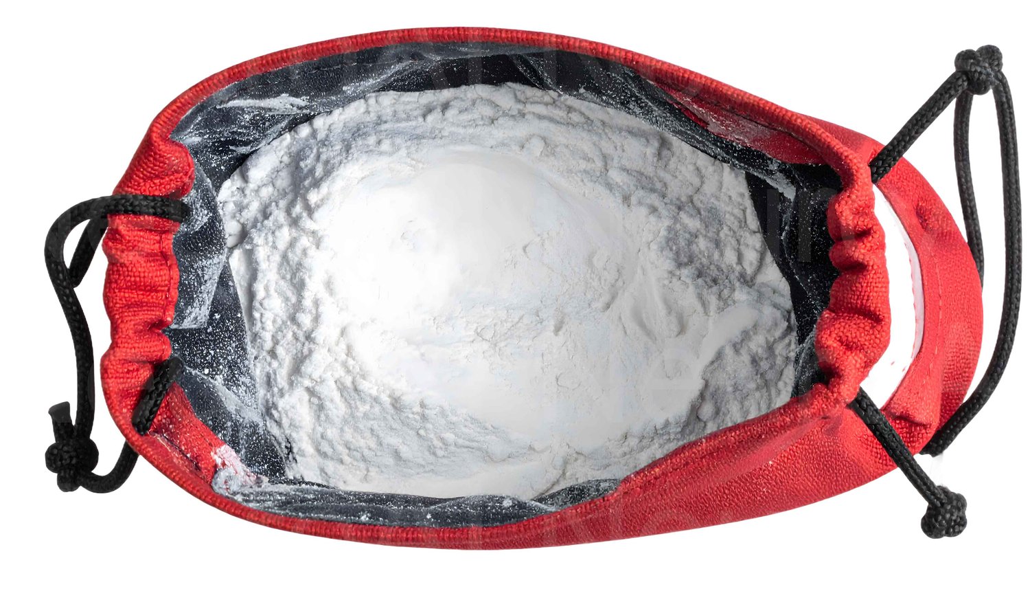 close-up AI-generated image captures a red drawstring chalk bag filled with white chalk powder (magnesium carbonate), viewed from above. The powder's texture and the bag's fabric are rendered realistically, and the entire visual is cleanly isolated on a transparent background, making it an excellent asset for sports and fitness content.