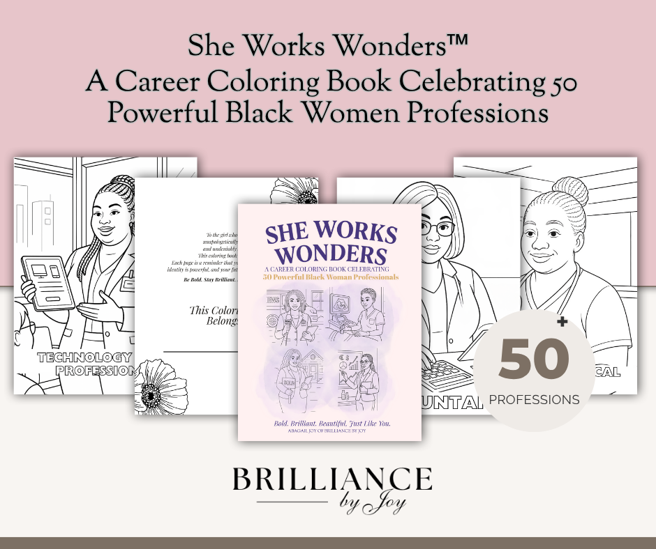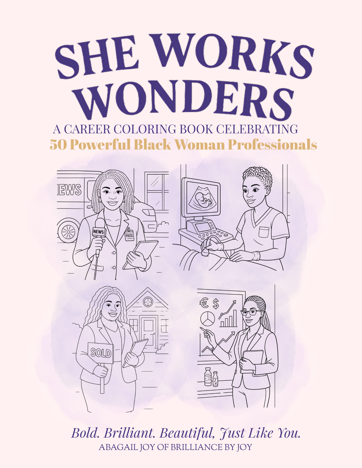 She Works Wonders™ is a powerful, therapeutic coloring book designed to celebrate and inspire Black women and girls. With 50 bold, career-centered illustrations, this creative resource affirms identity, promotes emotional wellness, and sparks career exploration across generations.