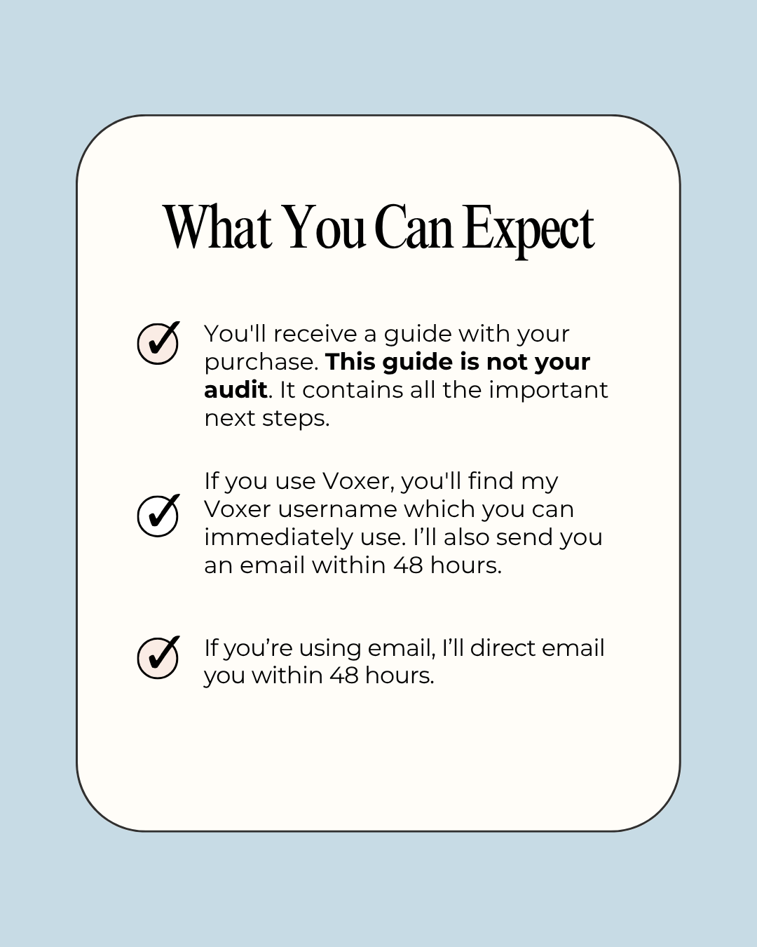 - Once you make your purchase, you'll get immediate access to my Voxer user name. If you prefer email, you can expect an email within 48 hours.