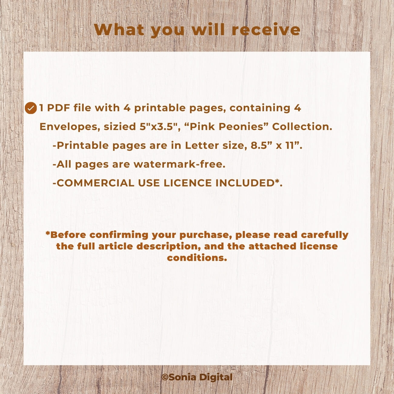 🔸4 printable pages containing 4 Envelopes sized 5”x3.5”, “Pink Peonies” Collection. Printable pages are in Letter size (8.5”x11”). Envelope format identical on all pages. All pages are sold watermark-free. Commercial use license included*.