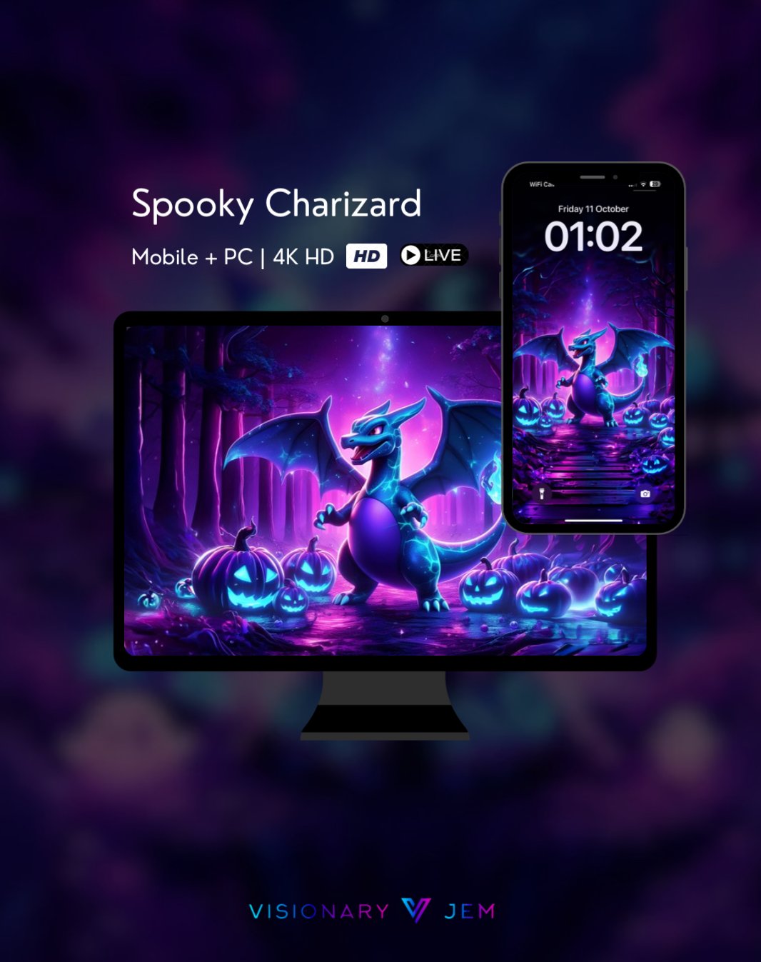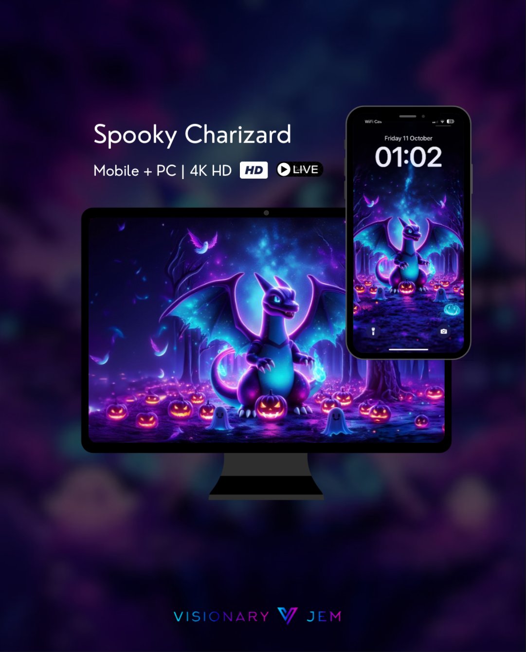 Transform your Screens with Spooky Charizard Wallpaper pack, ideal for gamers, streamers, and digital art enthusiasts.