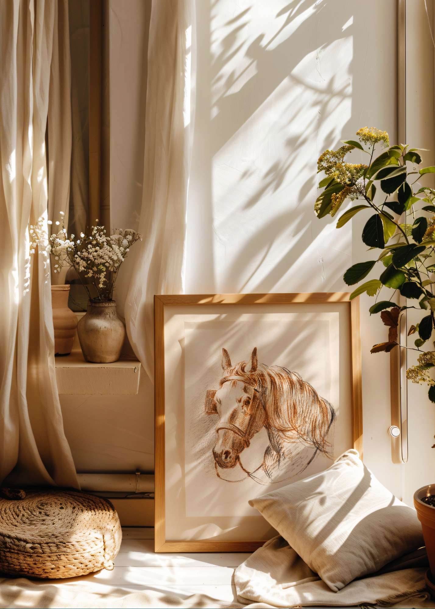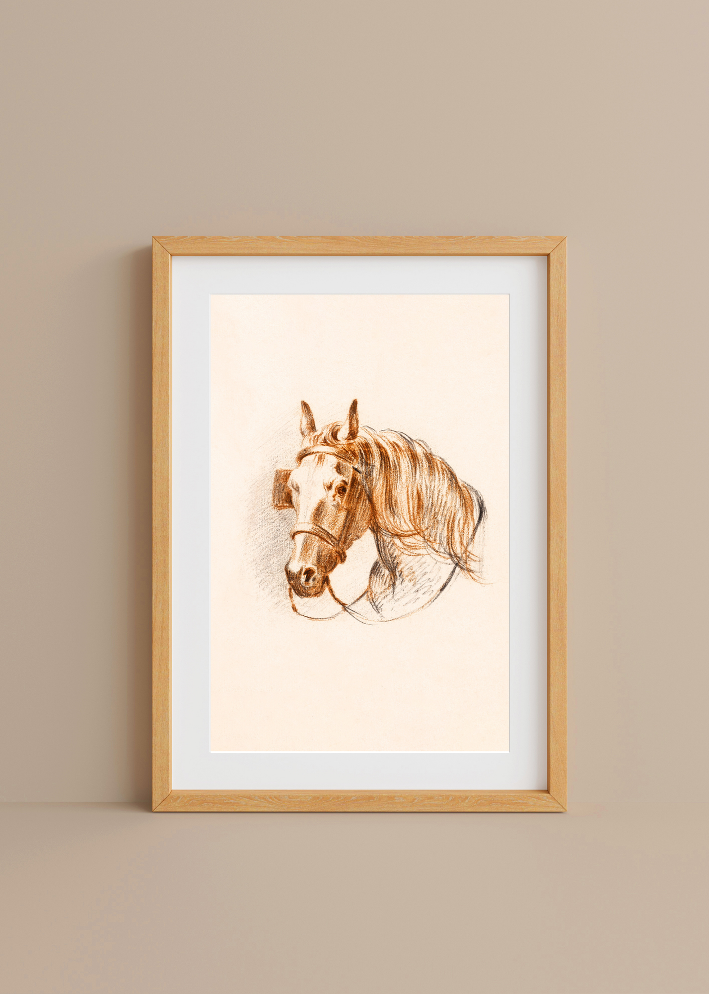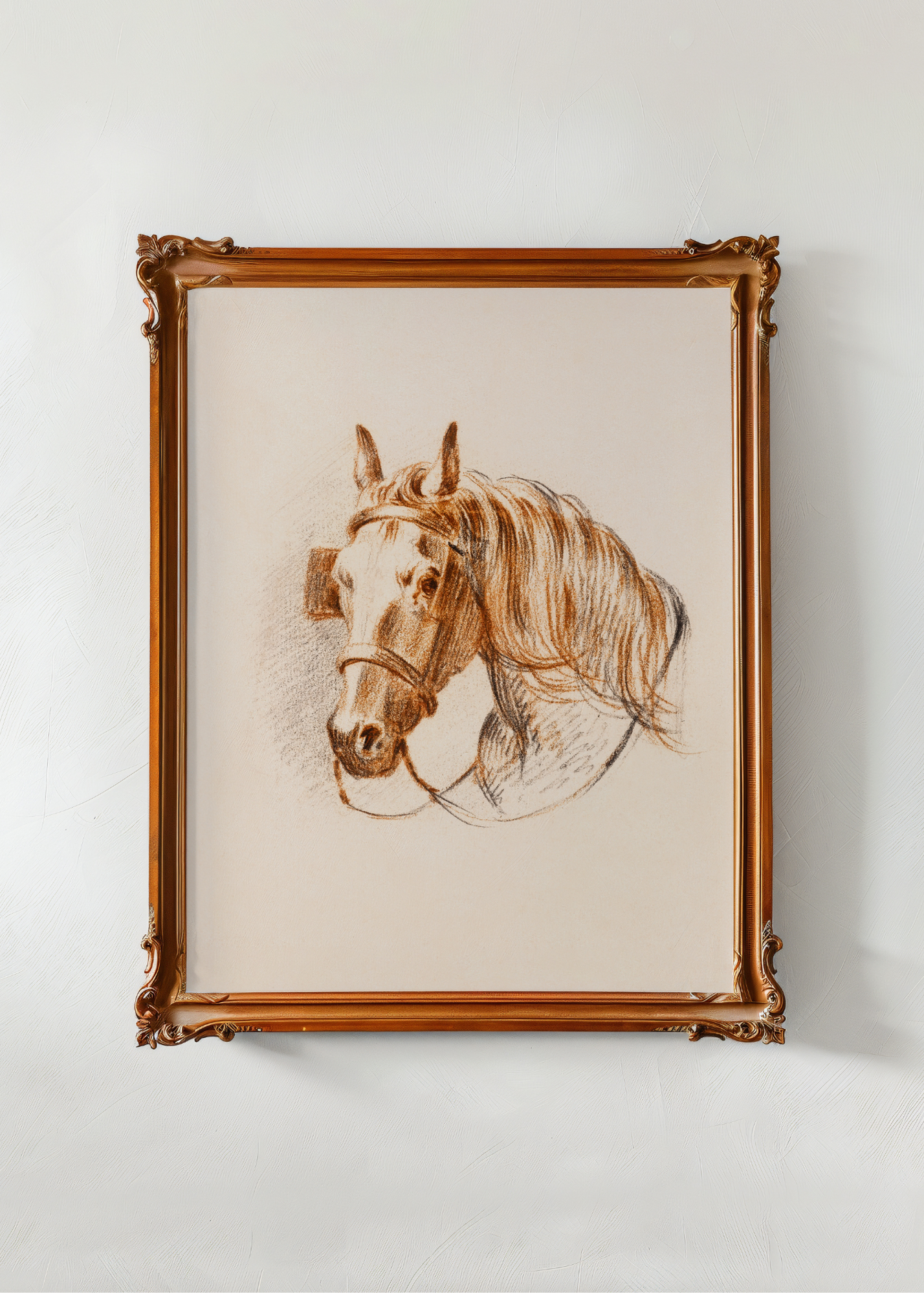 Here, the horse is neither galloping nor bridled, but wholly itself—majestic in its simplicity. The arch of the neck holds both power and grace, the ears alert, the gaze steady and unflinching. Each mark on the paper whispers of anatomy, yes, but also of spirit: wildness honed by familiarity, strength tempered by patience.