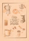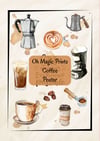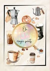 Start your day the right way with this charming, hand-illustrated poster that celebrates everyone’s favorite ritual — coffee! Featuring beautifully painted brewers, cups, beans, and the inspiring quote “Coffee Makes Everything Possible”, this artwork brings a cozy café vibe to any space.