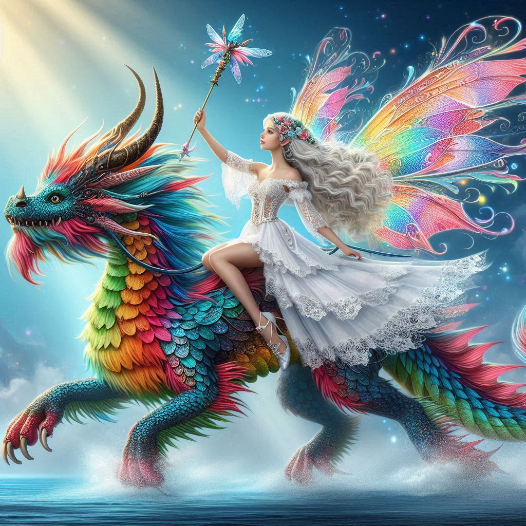 Colorful Fairy Riding a Dragon, printable size will fit up to a 24in x 16in frame. You will get a PNG file with the size in pixels 2304 x 1536.