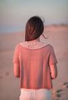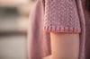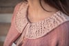 This is a light spring cardigan knitted from the top-down, seamlessly, and with a circular yoke. The hems are knitted in corrugated ribbing with a contrasting color. The collar is knitted last, from picked-up stitches along the neckline. The lace stitch is described in both chart and written instructions.