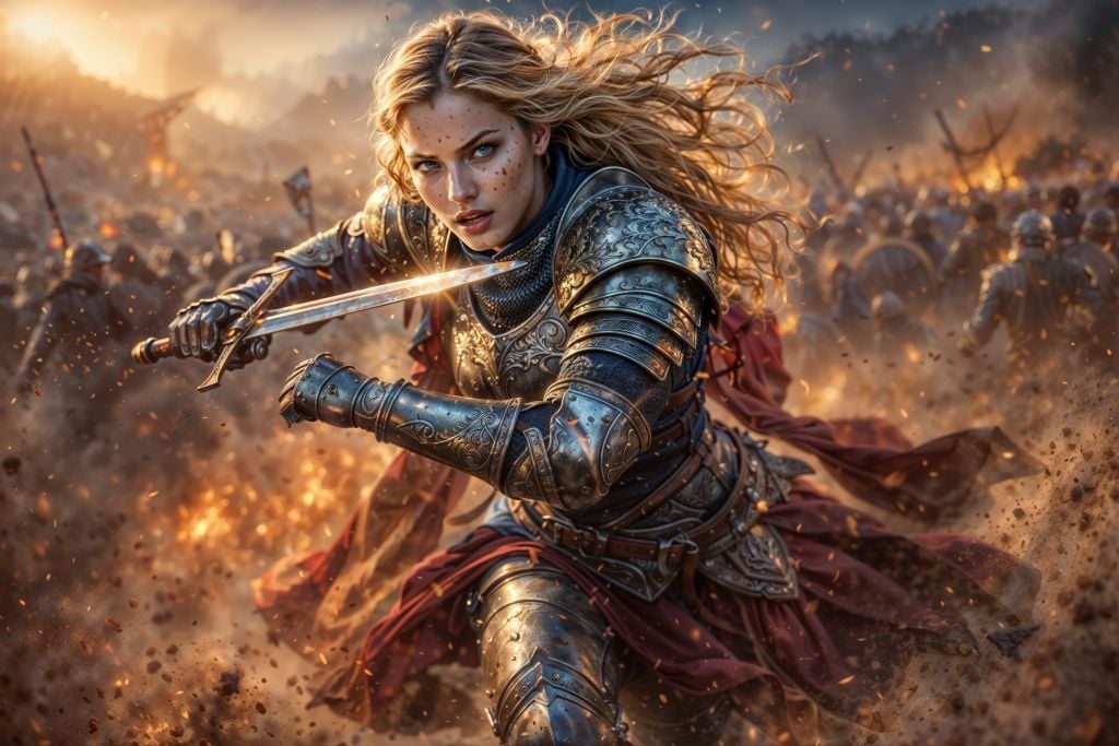 Turn your wall into a cinematic battlefield with Emberstorm Knight, a jaw-dropping 10K ultra-high-resolution artwork packed with motion, firelight, and fearless intensity. The wind-whipped hair, freckled determination, and exquisitely engraved steel armor are captured with razor-sharp clarity—while sparks and dust swirl around her like the moment before impact.