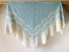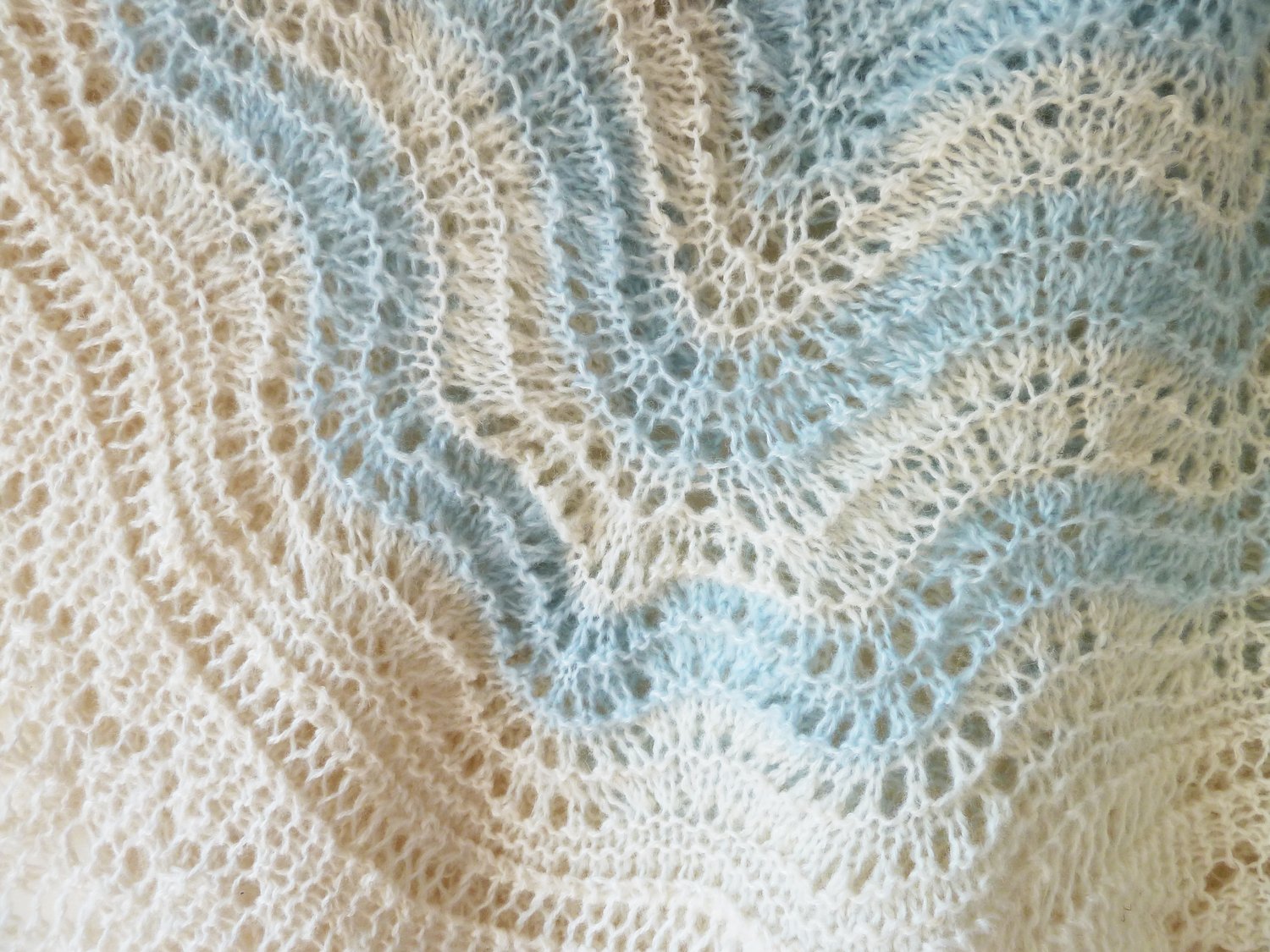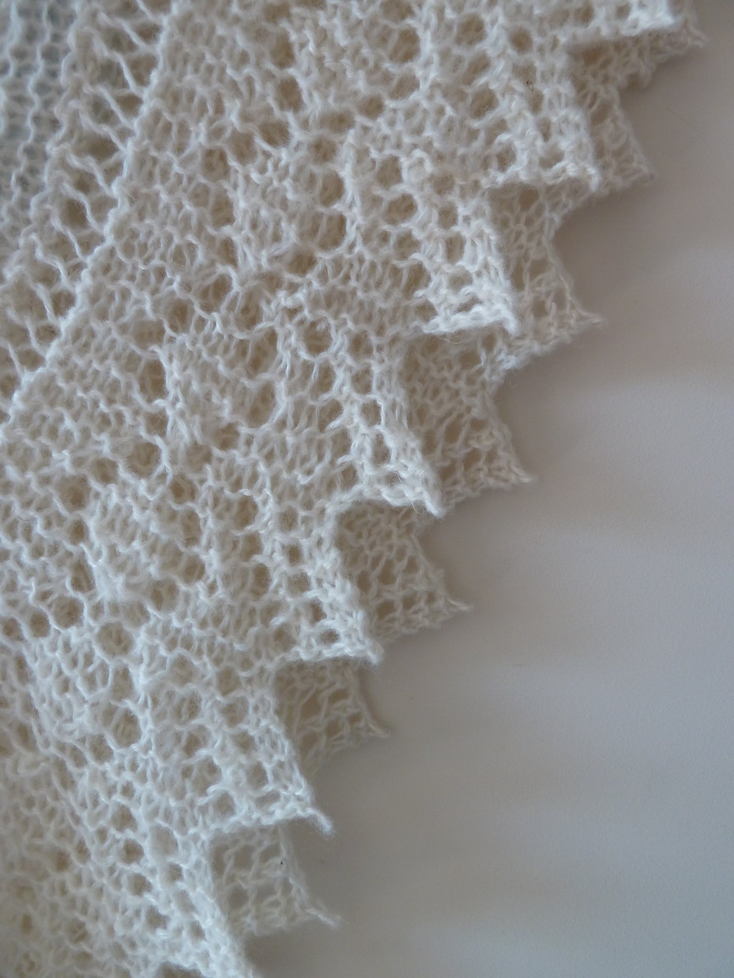 Built from inside to the outside, this hap has its centre square knitted diagonally back and forth in garter stitch with Cat’s Paw lace motifs. Based on that is the Old Shale wavy border made in the round and finished with a full version of the traditional peaked edging formed perpendicular to the border.