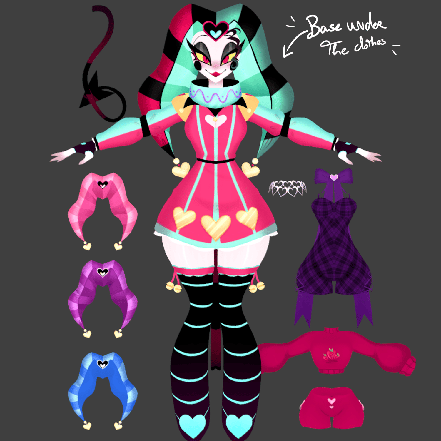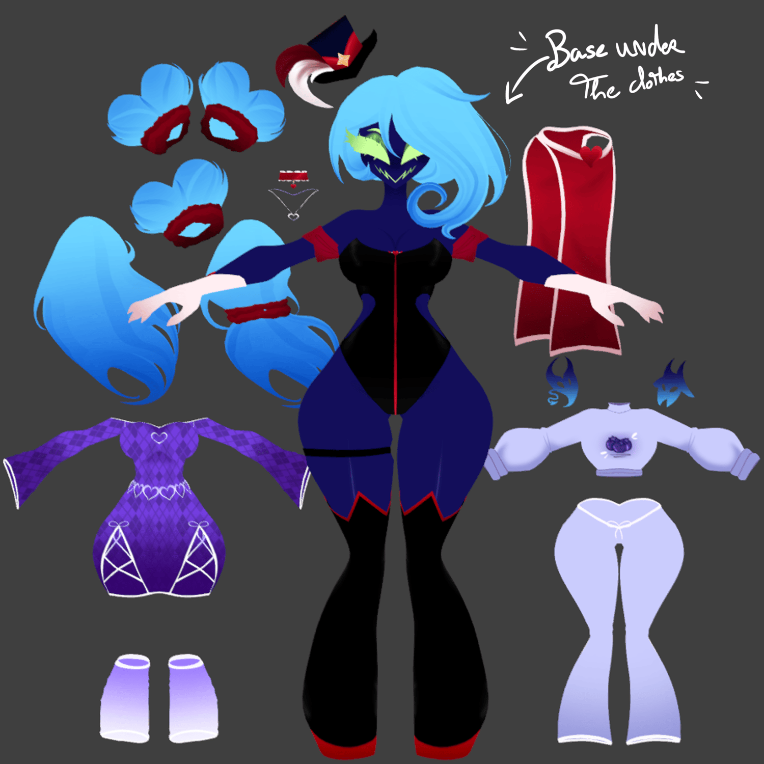 - Outfits accessories : main skirt on/off, pajamas color swap, hat on/off, demons on/off, jewelry