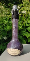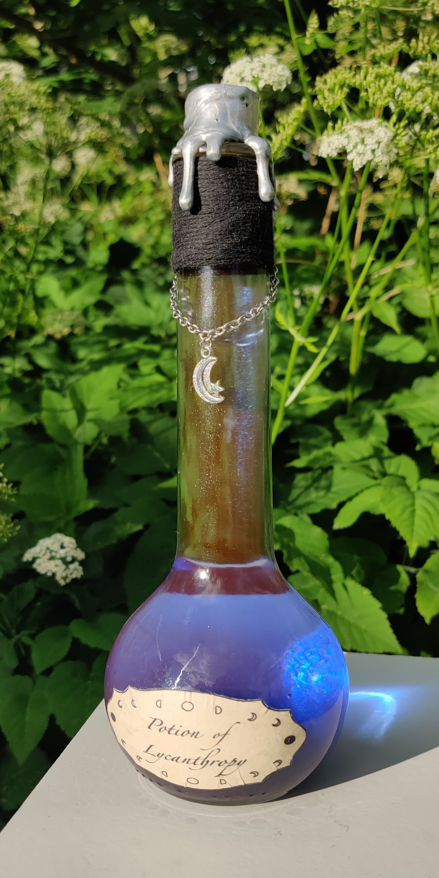 Pullossa on sinistä nestettä ja se on koristeltu käsintehdyllä etiketillä ja nauhalla sekä ketjulla ja riipuksella.