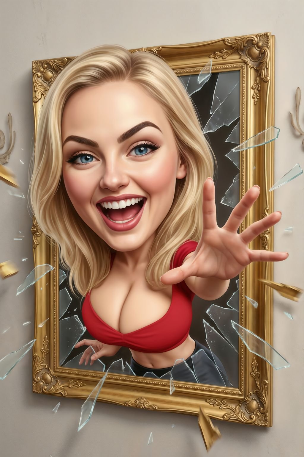 In this hilarious, high-impact artwork, Samantha doesn’t just steal the spotlight—she breaks the frame, sends glass flying, and reaches straight into your space with a grin that says: “Surprise.” The ornate golden frame and shattered mirror shards turn a simple moment into a full-on 3D punchline—part cartoon energy, part cinematic pop-art chaos.