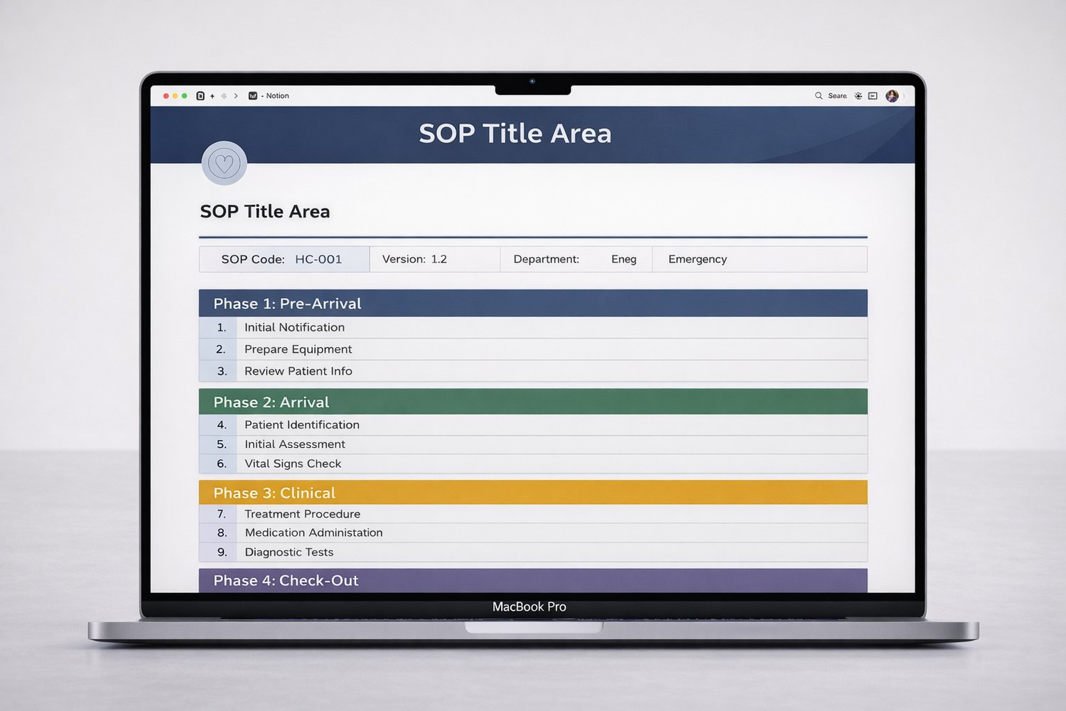 This SOP covers the complete patient journey — from booking confirmation to post-visit follow-up — in 23 structured steps across 5 colour-coded phases.