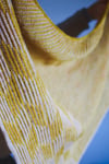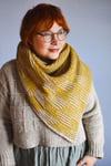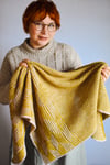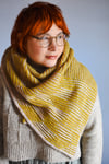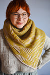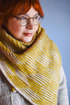 A triangle shawl featuring a graphic Brioche chevron pattern and horizontal ribbing.